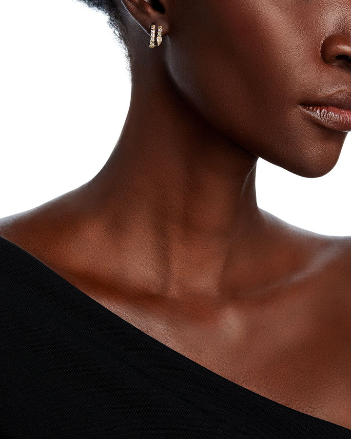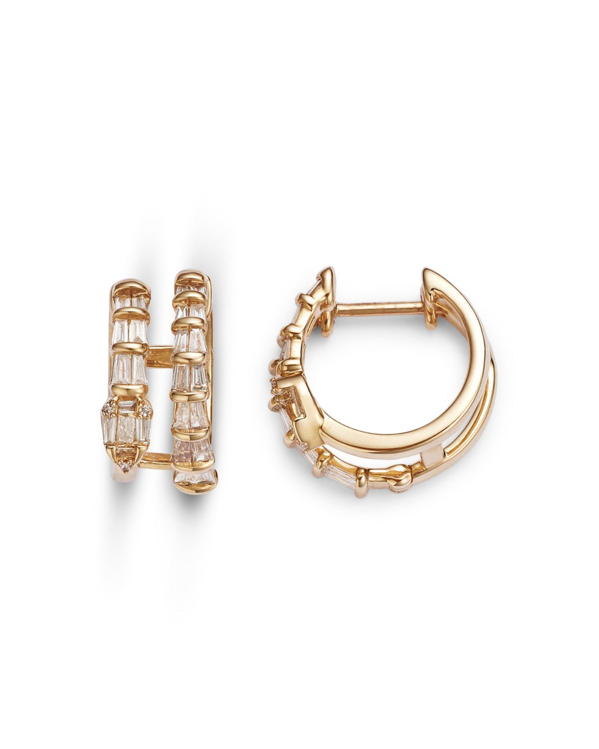 The Diamond Round & Baguette Double Row Serpent Hoop Earrings in 14K Yellow Gold, 0.50 ct. t.w. by Bloomingdale's Fine Collection feature stunning serpent-shaped hoops with two rows of diamonds—round and baguette (0.50 ct. t.w.; color/clarity: HI/I1I2)—creating a dramatic and sophisticated look. The 0.55' diameter is perfect for adding elegance to any ensemble, and the hinge hoop closure ensures a secure fit.