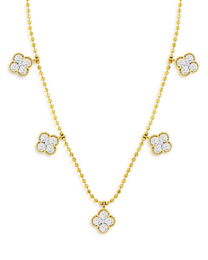Diamond Clover Station Necklace in 14K Yellow Gold from Bloomingdale's Fine Collection features sparkling diamond clover charms dangling from a gold bead chain. This necklace is a playful yet elegant accessory, perfect for adding a touch of shimmer to any look.