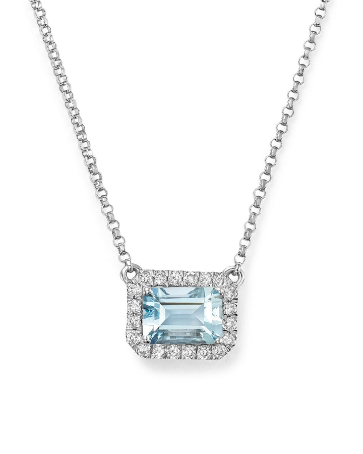 Aquamarine & Diamond Pendant Necklace in 14K White Gold, 17' from Bloomingdale's Fine Collection features an emerald-cut aquamarine pendant surrounded by diamonds, making it a sophisticated addition to any jewelry collection.