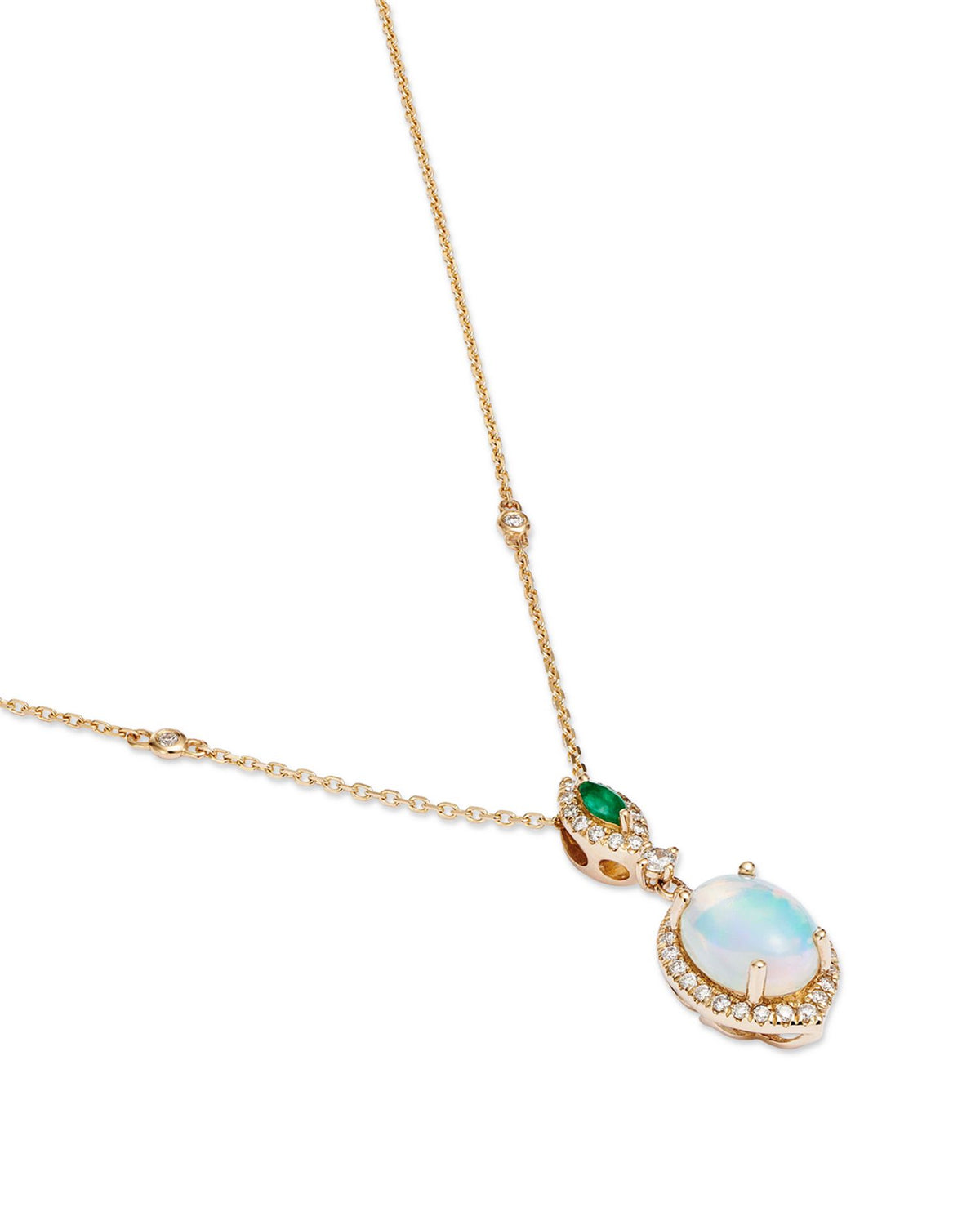 Ethiopian Opal, Emerald, & Diamond Pendant Necklace in 14K Yellow Gold, 18'