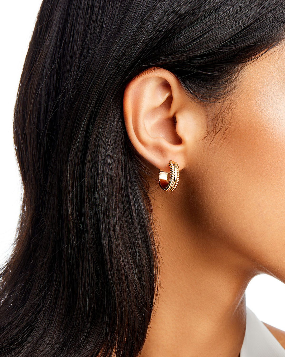 Polished Rope Edged Huggie Hoop Earrings in 14K Yellow Gold from Bloomingdale's Fine Collection feature a luxurious rope edge border, elevating these huggie hoop earrings to a statement-making piece.