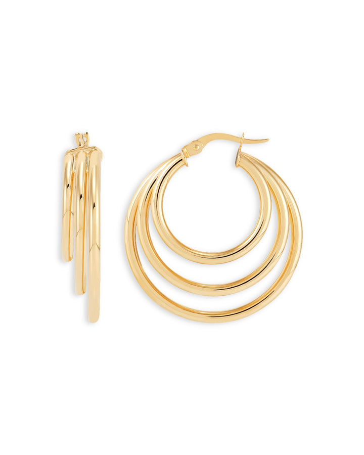 These 14K Yellow Gold Layered Tube Hoop Earrings by Bloomingdale's Fine Collection offer a chic and bold look. Three layers of polished 14K yellow gold form these statement hoop earrings, creating a sleek and modern silhouette that will elevate any ensemble, from casual to evening wear.