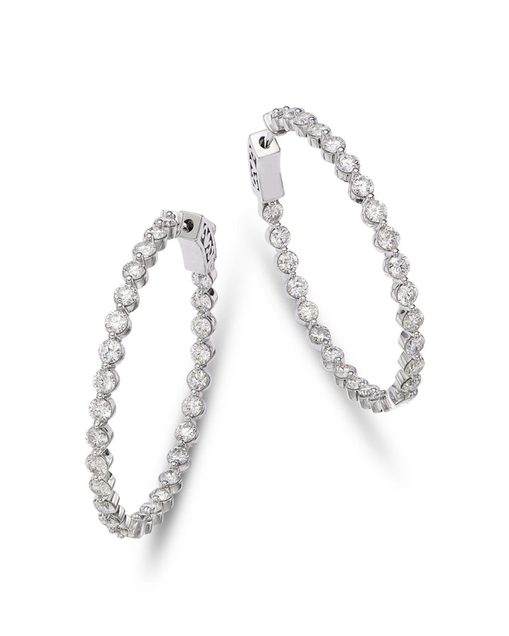 These Diamond Inside Out Medium Hoop Earrings by Bloomingdale's Fine Collection offer a radiant, sophisticated look. Featuring 4.0 ct. t.w. of diamonds set inside and out, the earrings exude elegance and brilliance from every angle. Made in 14K white gold, they are the perfect accessory for both special occasions and everyday luxury.