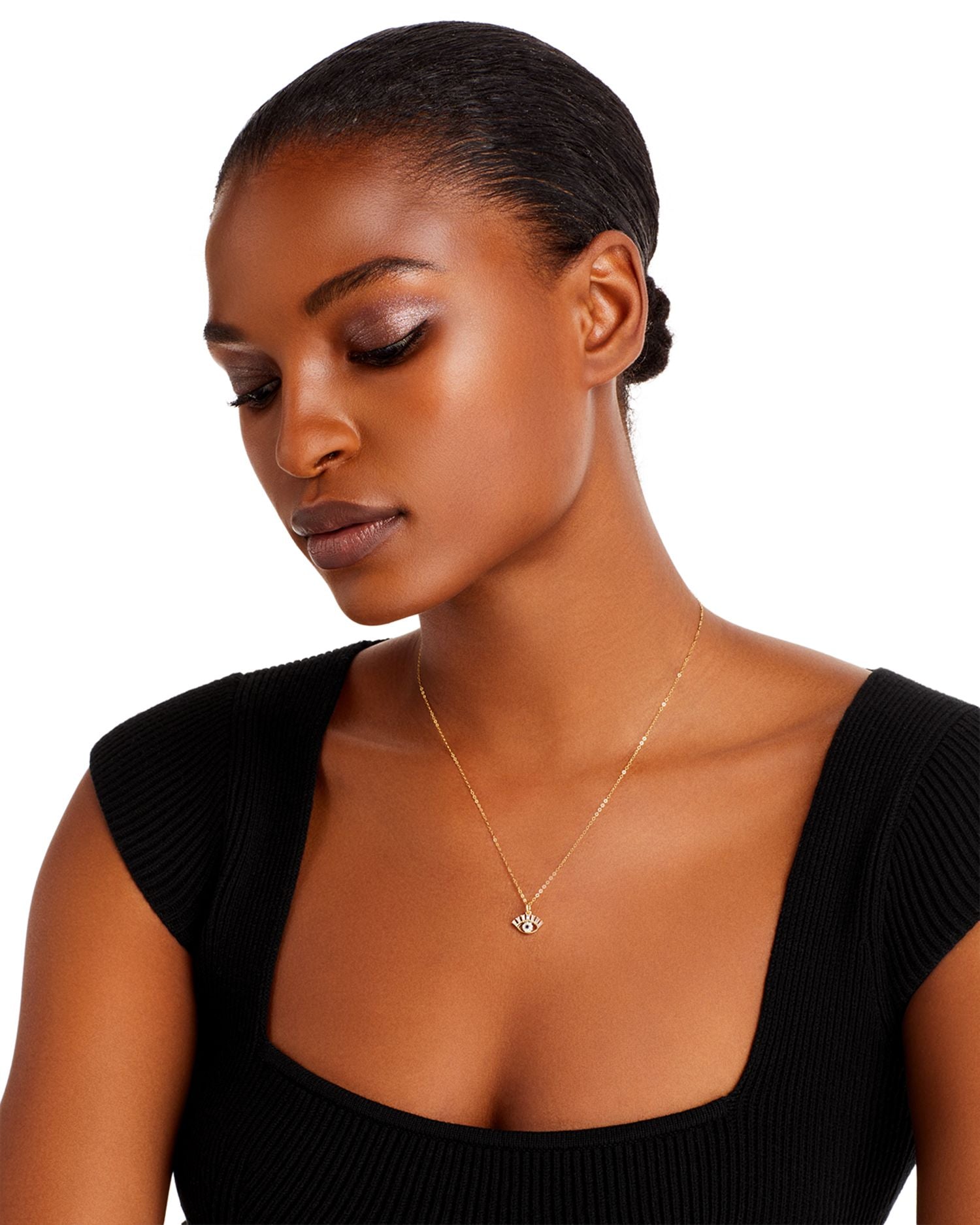 This Diamond & Blue Sapphire Evil Eye Pendant Necklace in 14K Yellow Gold by Bloomingdale's Fine Collection blends the protection of the evil eye symbol with the sparkle of diamonds and the deep blue allure of sapphires. The 0.10 ct. t.w. diamonds and the 0.04 ct. t.w. blue sapphire make this necklace a perfect statement piece to ward off negative energy while adding a touch of luxury to your look.