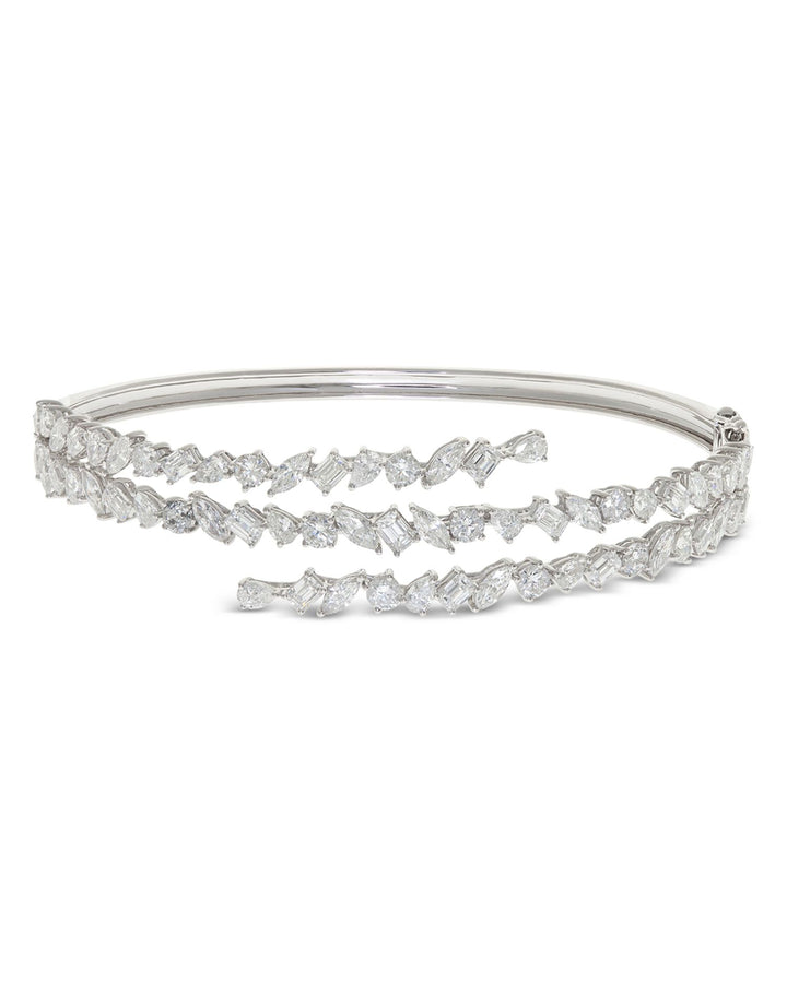 This 18K White Gold Diamond Bypass Bracelet, 6.0 ct. t.w. from the Luxe collection by Bloomingdale's Fine Collection is a radiant bracelet featuring a mix of pear-shaped, emerald-, marquise-, and round-cut diamonds. This exquisite piece, with a 6.75'L adjustable length, is perfect for adding luxury and elegance to your wrist.