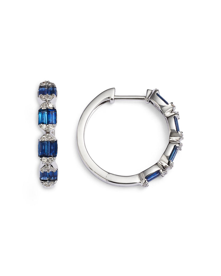 These Sapphire & Diamond Hoop Earrings by Bloomingdale's Fine Collection combine the timeless allure of blue sapphires with the brilliance of diamonds, alternating beautifully along sleek white gold hoops. A sophisticated choice for any occasion.