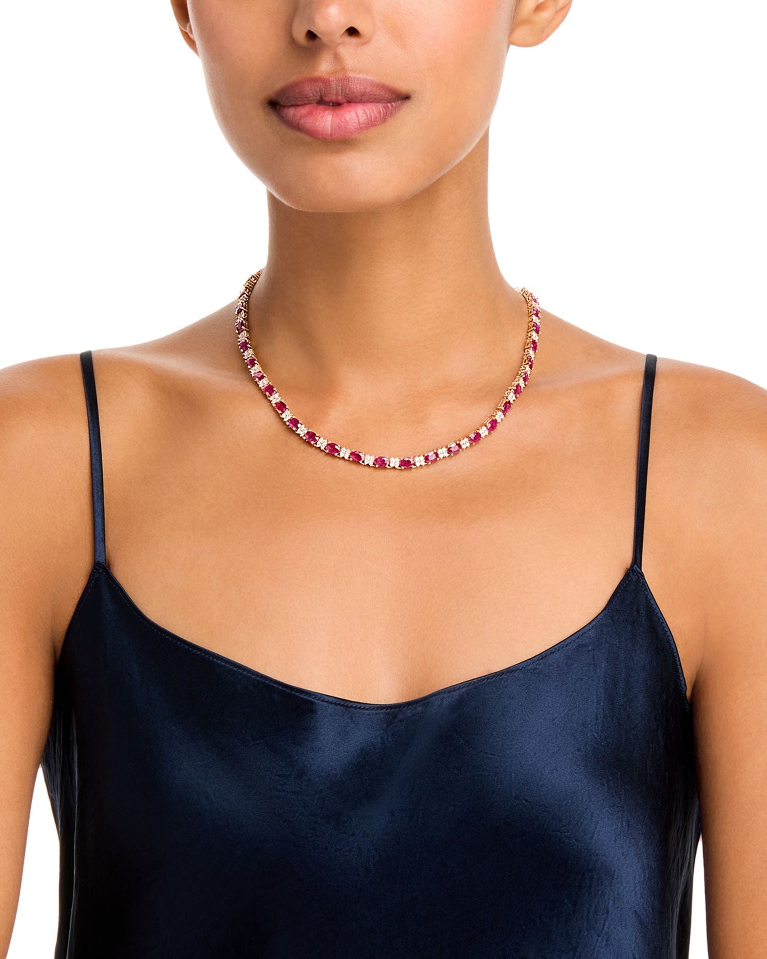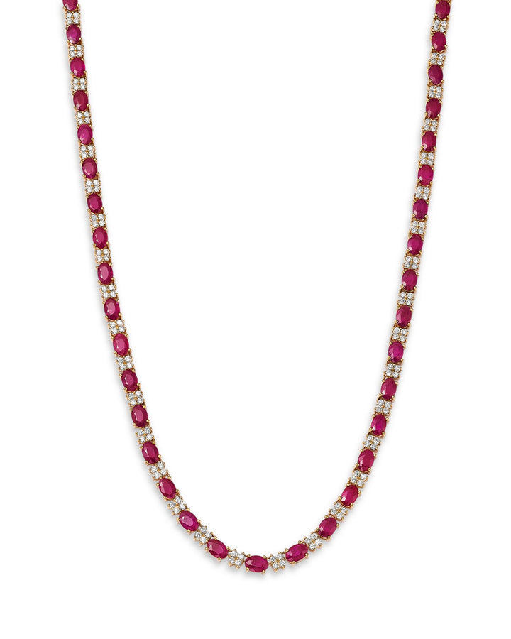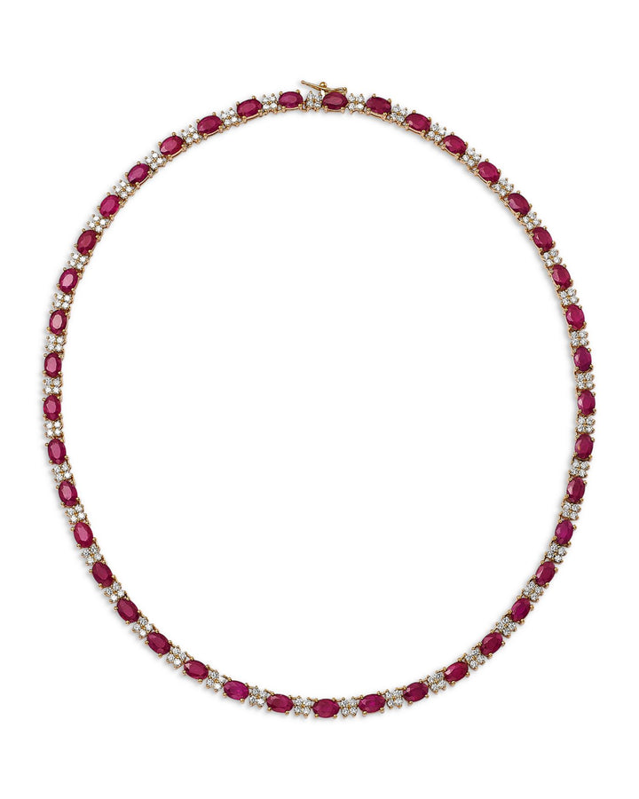 This Ruby & Diamond Tennis Necklace by Bloomingdale's Fine Collection radiates elegance with its vibrant oval-cut rubies alternating with small diamond clusters. A luxurious collar necklace, it’s a bold yet timeless statement piece for special occasions.