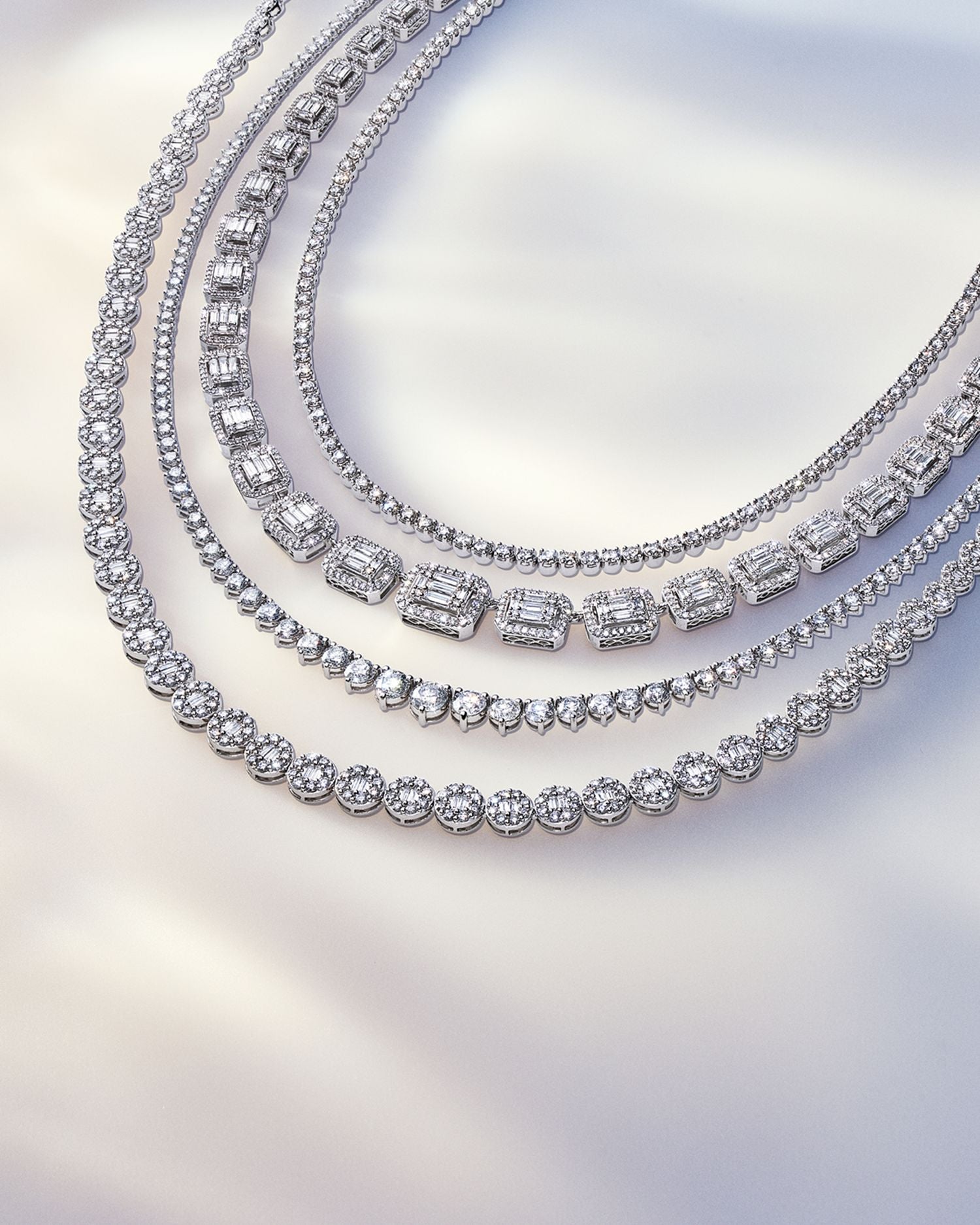Made in 14K white gold, featuring diamonds totaling 15.0 ct. t.w. (HI color, I2 clarity). The necklace measures 17'L and secures with a box-tab closure. The white gold is rhodium-coated for enhanced brilliance and may require replating.