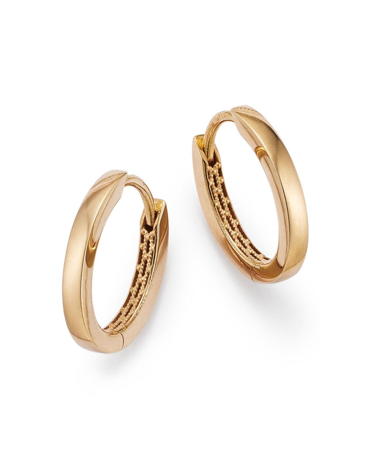 Handcrafted in 14K yellow gold. Features hinge hoop closures. Made in Italy.