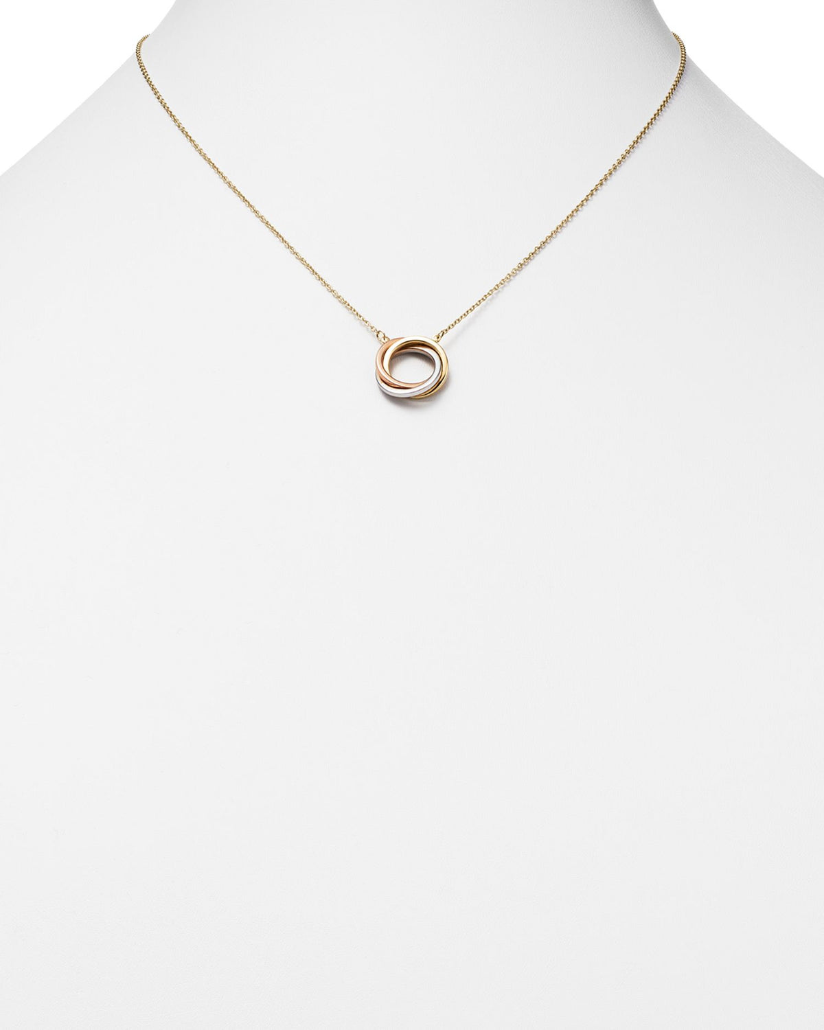 This 14K Rose, Yellow, and White Gold Ring Pendant Necklace by Bloomingdale's Fine Collection combines the beauty of three gold tones. Featuring interlocked rings of rose, yellow, and white gold at the center, this delicate necklace is a versatile and elegant piece.