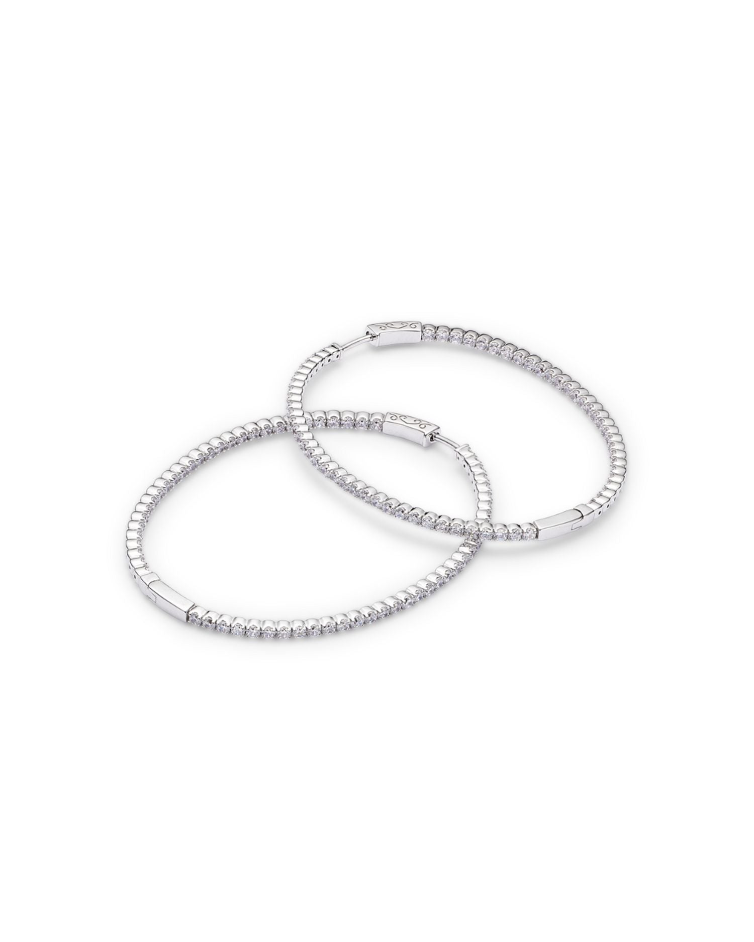 Handcrafted in 14K white gold; diamonds: 3.0 ct. t.w., color/clarity: HI/I1I2; 2.15' diameter; hinge hoop closure. White gold is surface-coated with rhodium to enhance metal color and shine; it may wear off over time requiring replating.