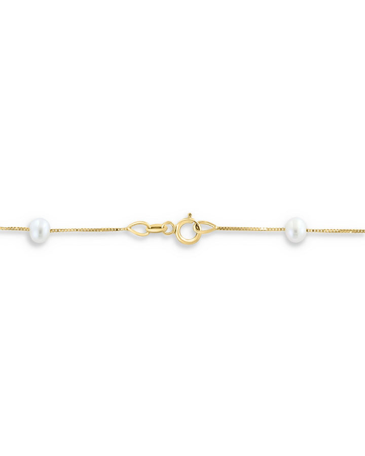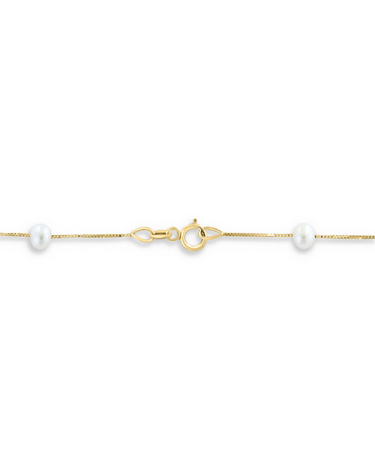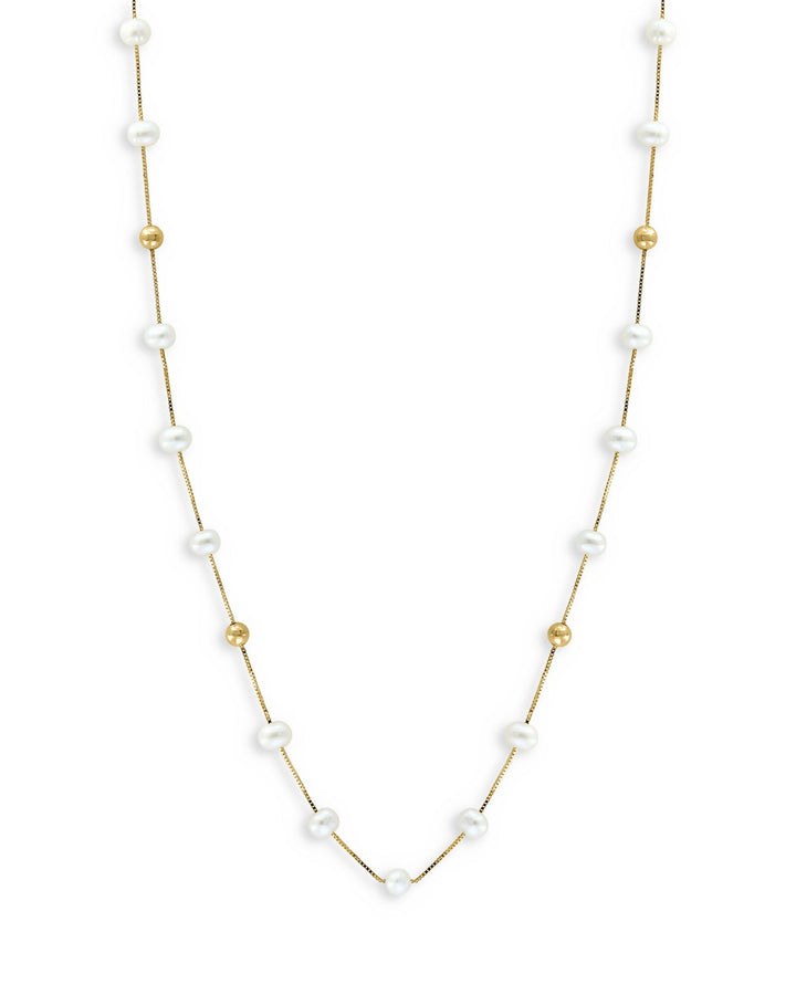 This Cultured Freshwater Pearl & Polished Bead Station Collar Necklace by Bloomingdale's Fine Collection is set with small 4mm cultured freshwater pearls and polished yellow gold beads. The 18" length and delicate design make this collar necklace an elegant addition to your collection, perfect for layering or wearing alone.