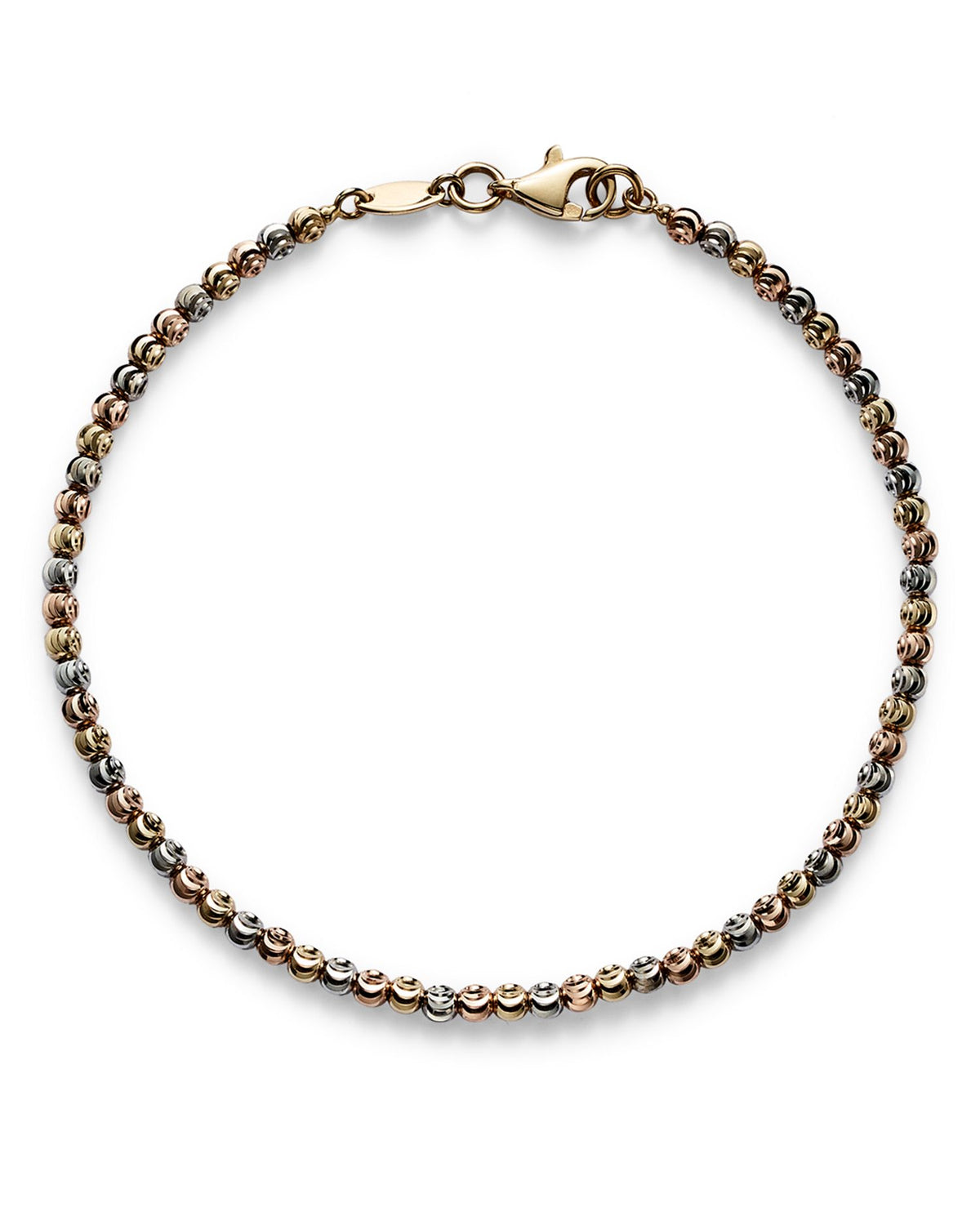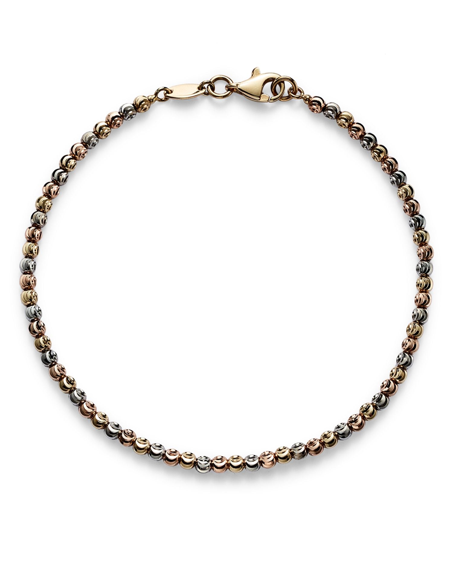 This 14K Yellow, White, and Rose Gold Beaded Bracelet by Bloomingdale's Fine Collection features alternating gold beads in three stunning colors, creating a harmonious and eye-catching design. The 7.25" length and lobster clasp closure ensure a perfect fit, making this bracelet ideal for stacking or wearing alone.