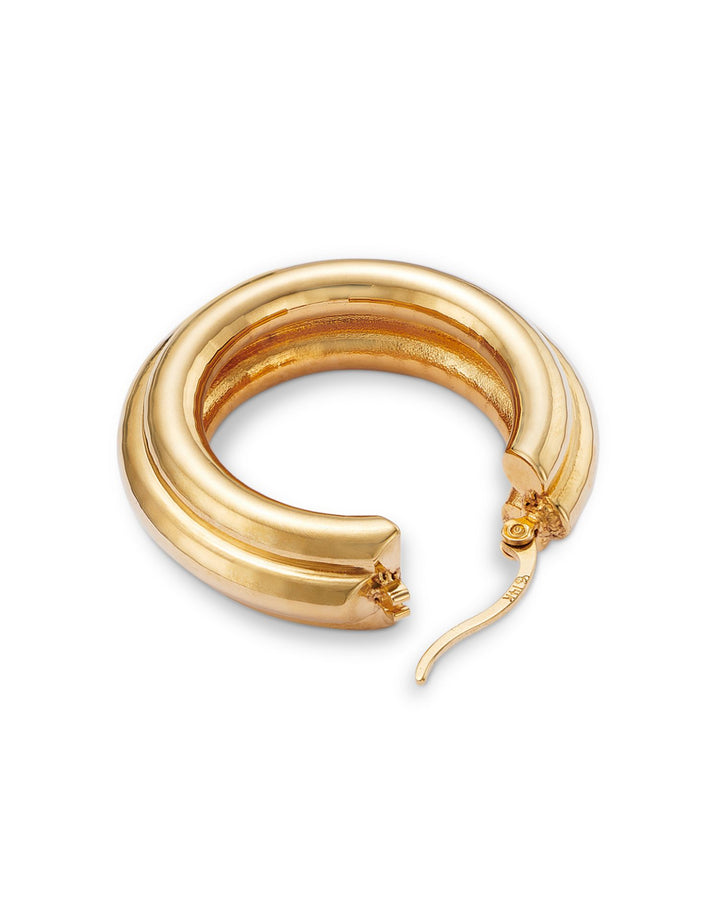 These Polished Triple Medium Hoop Earrings by Bloomingdale's Fine Collection offer a timeless design with three polished hoops stacked together. Crafted in 14K yellow gold, these earrings add a modern, elegant touch to any outfit. The click-top closure ensures a secure fit, making these hoops perfect for everyday wear or a refined statement piece.