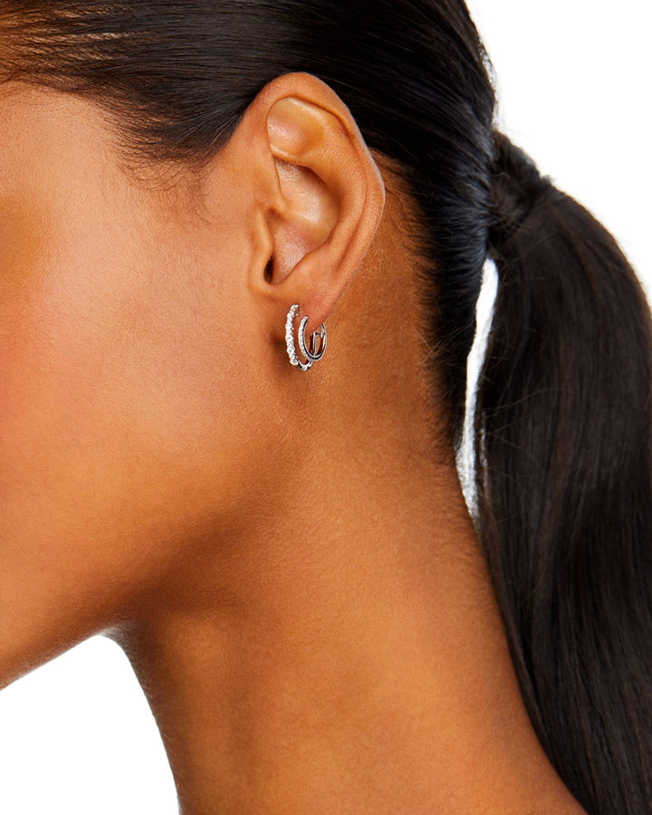 These Diamond Double Row Hoop Earrings by Bloomingdale's Fine Collection offer a glamorous and modern look with two rows of dazzling diamonds set in 14K white gold. The earrings give the illusion of multiple piercings while maintaining a sophisticated design. Perfect for adding a bold sparkle to any outfit, these hoops are both stylish and elegant.