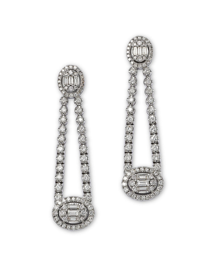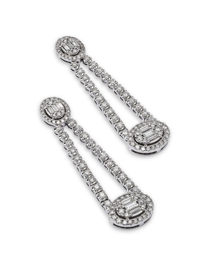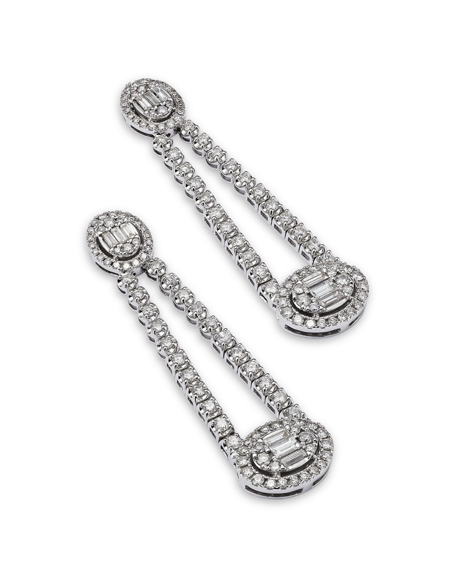 Diamond Round & Baguette Halo Mosaic Drop Earrings in 14k White Gold, 2.25 ct. t.w.