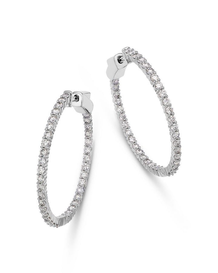 These Diamond Inside Out Medium Hoop Earrings by Bloomingdale's Fine Collection are a dazzling addition to any jewelry collection. Featuring 2 ct. t.w. of diamonds set inside and outside the hoops, the earrings radiate sparkle from every angle. Set in 14K white gold, these earrings are the perfect statement piece for any occasion.