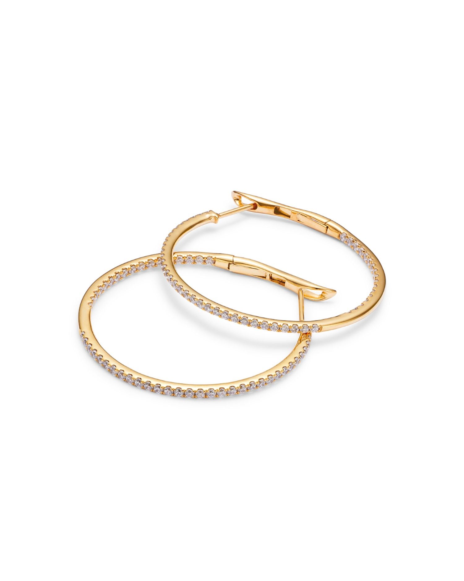 These 14K Yellow Gold Diamond Inside Out Round Hoop Earrings by Bloomingdale's Fine Collection feature polished gold hoops lined with 1.5 ct. t.w. of diamonds. The inside-out design ensures that the diamonds are visible from both sides, adding an extra dimension of brilliance to these already stunning earrings.