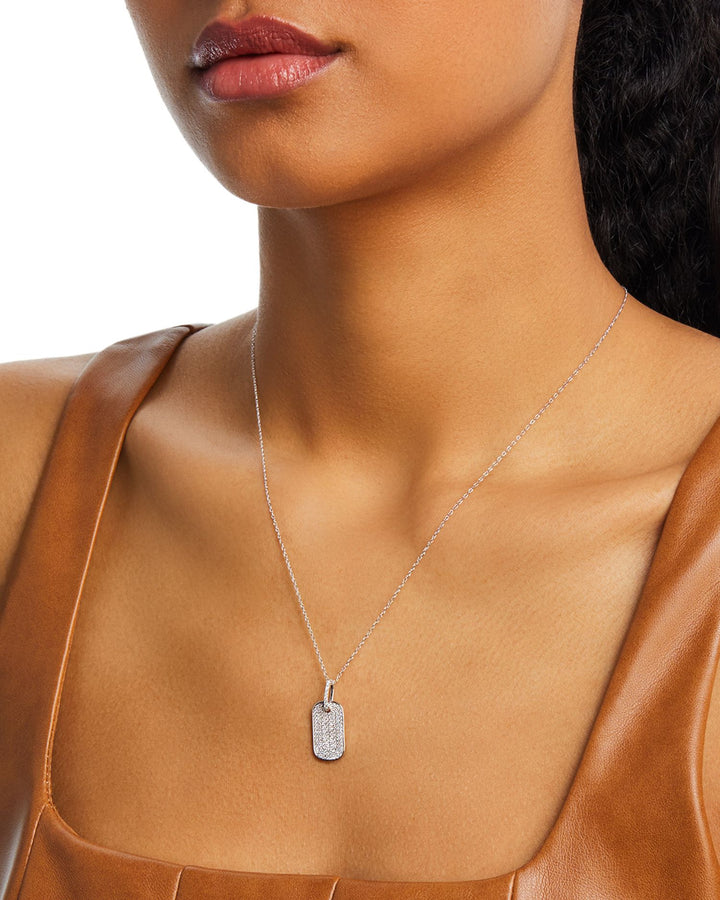 This Diamond Dog Tag Pendant Necklace by Bloomingdale's Fine Collection features a chic dog tag pendant adorned with 0.50 ct. t.w. of sparkling diamonds. Set in 14K white gold, this necklace offers a bold yet refined look, perfect for adding luxury and style to any ensemble.