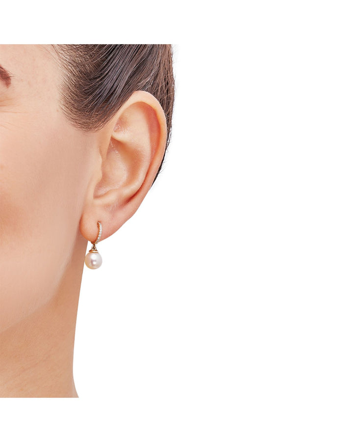 Handcrafted in 14K yellow gold, featuring 0.10 ct. t.w. diamonds (color/clarity: HI/I1I2) and 7-7.5mm cultured freshwater pearls. The earrings measure 0.75' in length and are equipped with a post back closure.