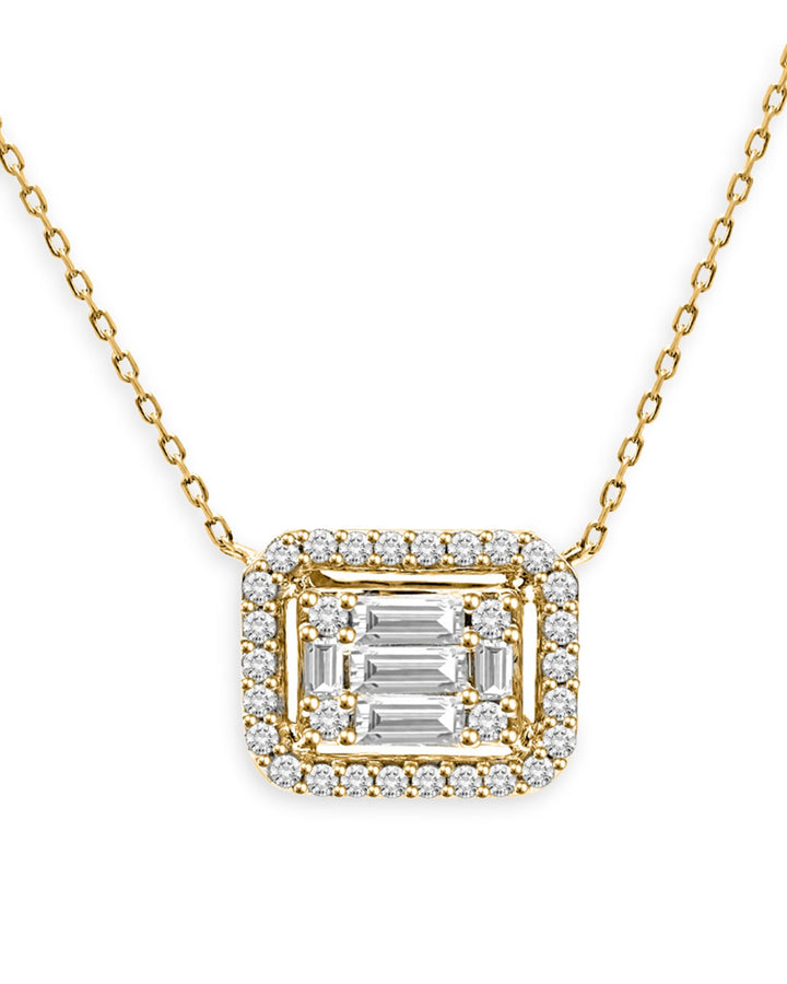 This Diamond Mosaic Pendant Necklace by Bloomingdale's Fine Collection features round and baguette diamonds brought together in a dazzling mosaic cluster design. Set in 14K yellow gold, this necklace adds an elegant touch of sparkle and sophistication, making it perfect for any occasion. The stunning mosaic pendant makes a bold statement while remaining versatile.