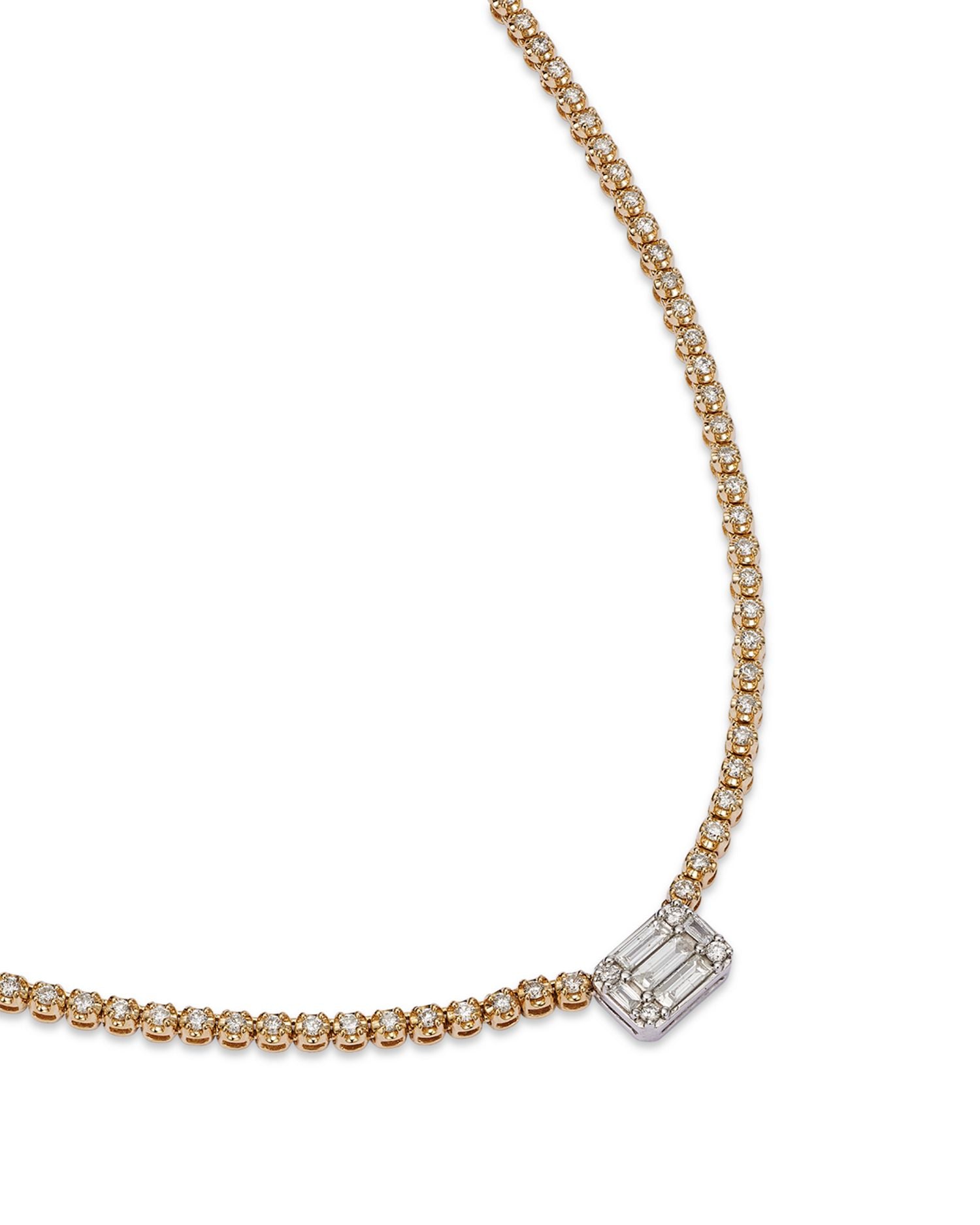 This Diamond Multi-Cut Mosaic Necklace by Bloomingdale's Fine Collection is a dazzling piece featuring a cluster of baguette diamonds at its heart, surrounded by additional brilliant stones. Set in a combination of 14K yellow and white gold, this 2.30 ct. t.w. necklace makes a bold statement, perfect for evening wear or as the centerpiece of a refined look.