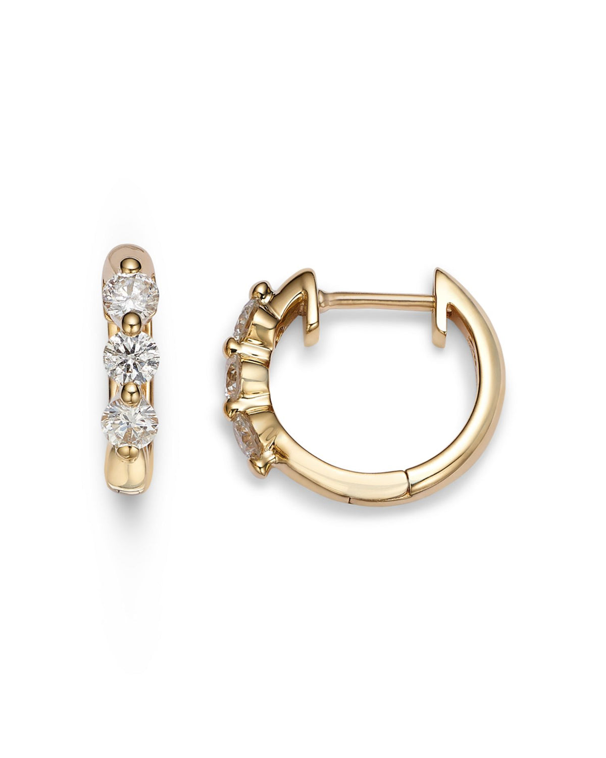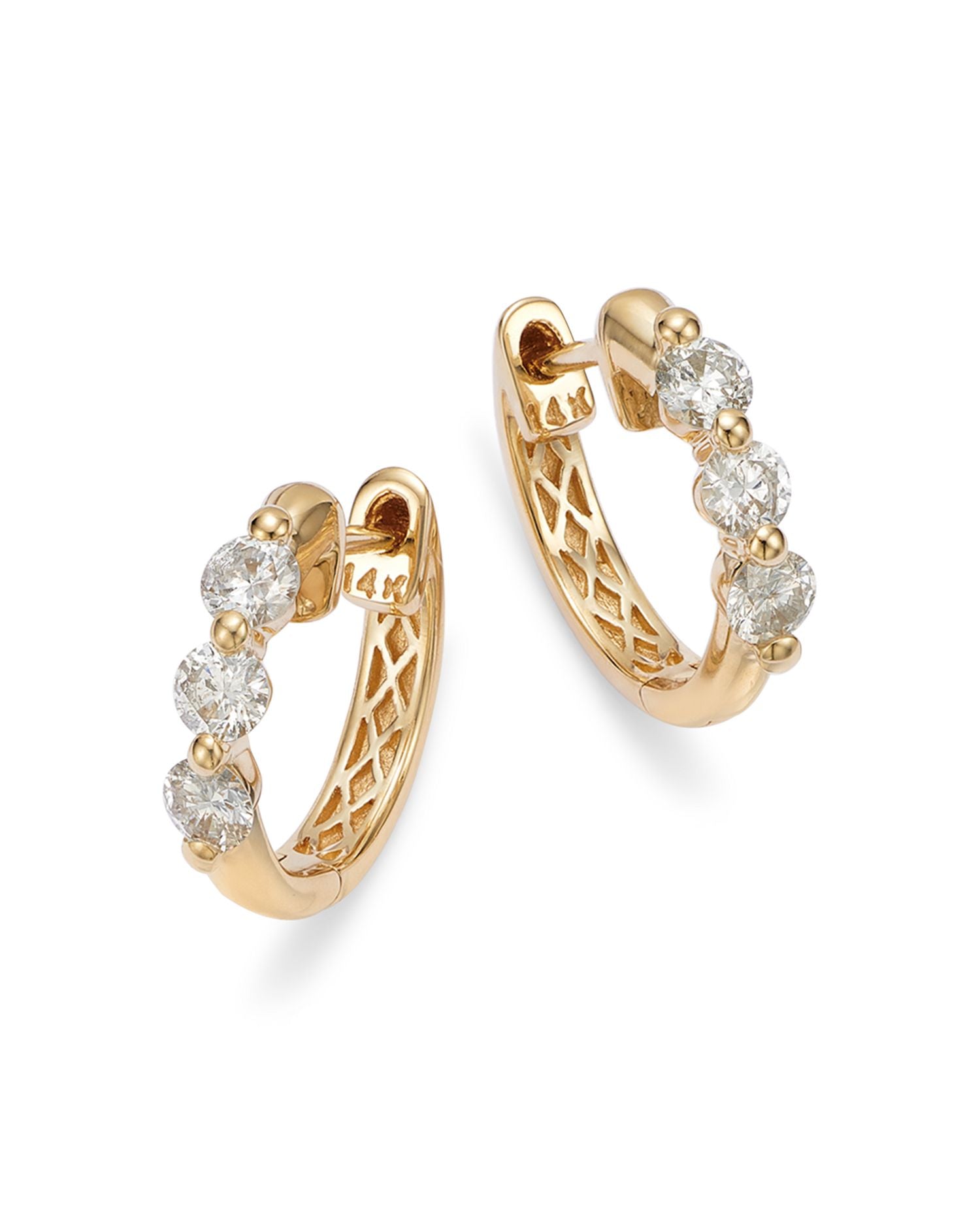 These Diamond Hoop Earrings by Bloomingdale's Fine Collection feature enchanting trios of diamonds adorning small, graceful hoops. The perfect balance of elegance and sparkle, these 14K yellow gold earrings are ideal for adding a touch of glamour to any look.