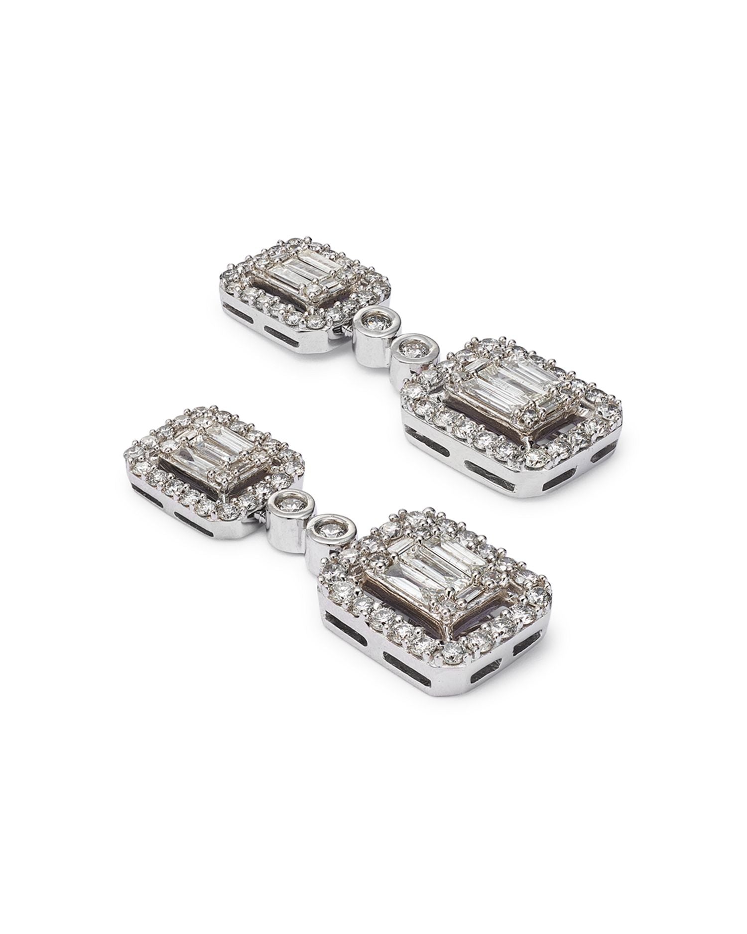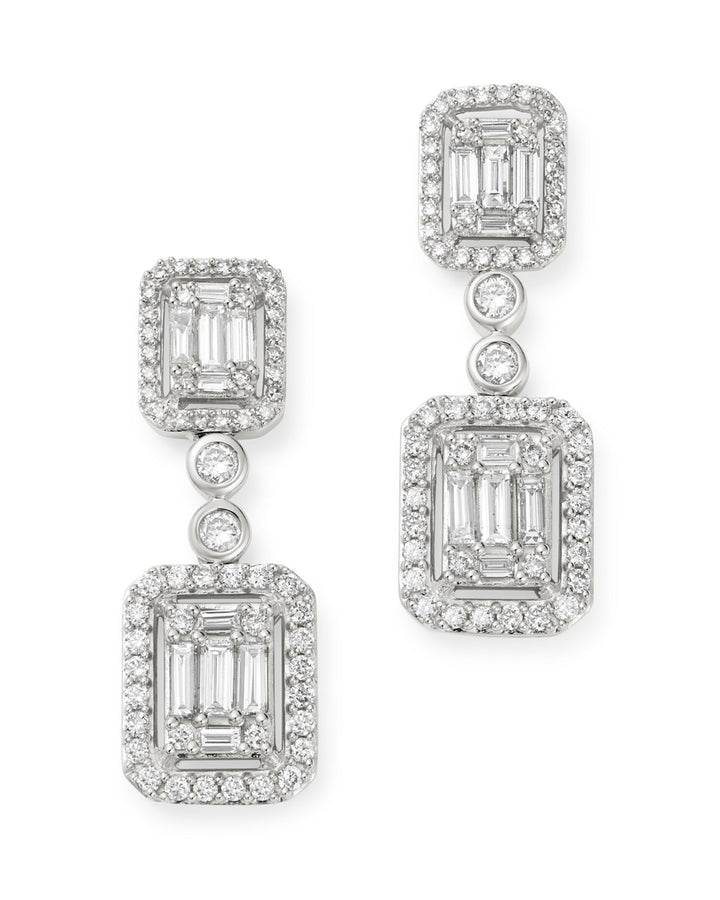These Diamond Mosaic Drop Earrings by Bloomingdale's Fine Collection are designed with a blend of round, baguette, and bezel-set diamonds that sparkle from every angle. Set in 14K white gold, these earrings are perfect for adding a touch of elegance and luxury to any occasion.