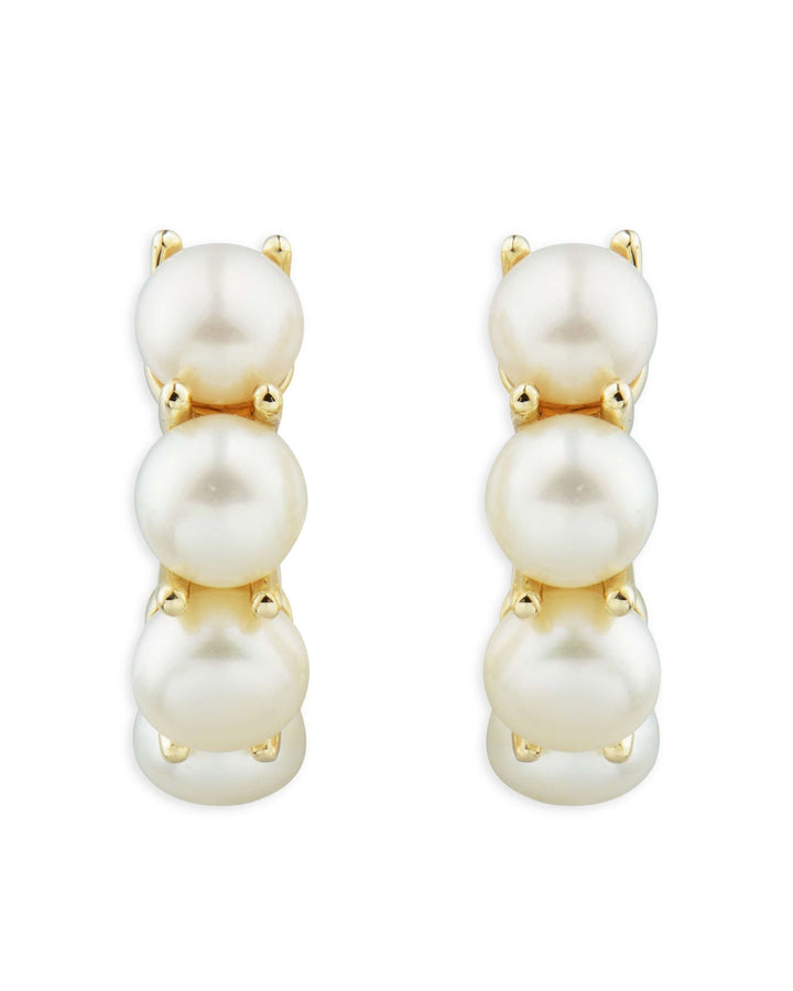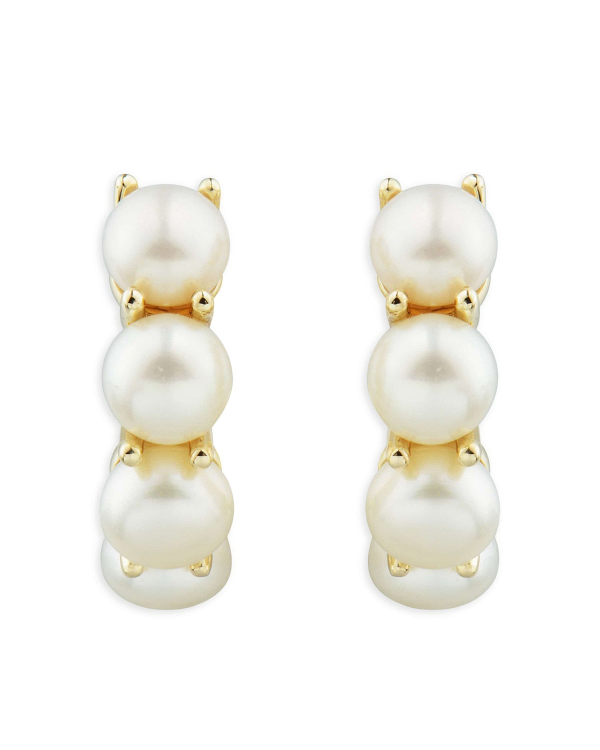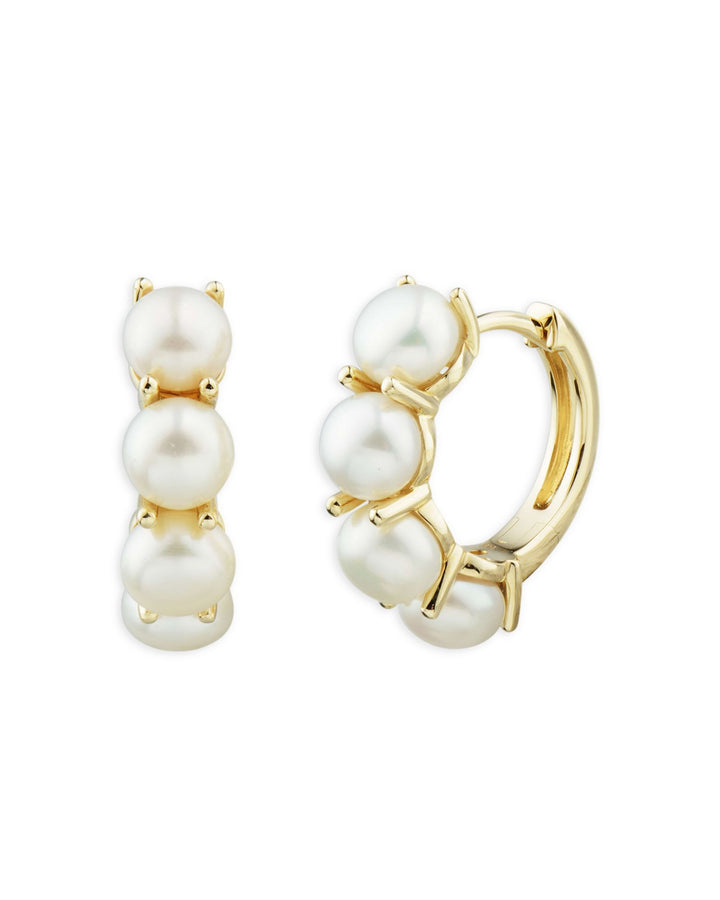 Cultured freshwater pearls: 5-5.5mm, set in 14K yellow gold, measuring 0.625' in length. Hinge hoop closure for secure wear.