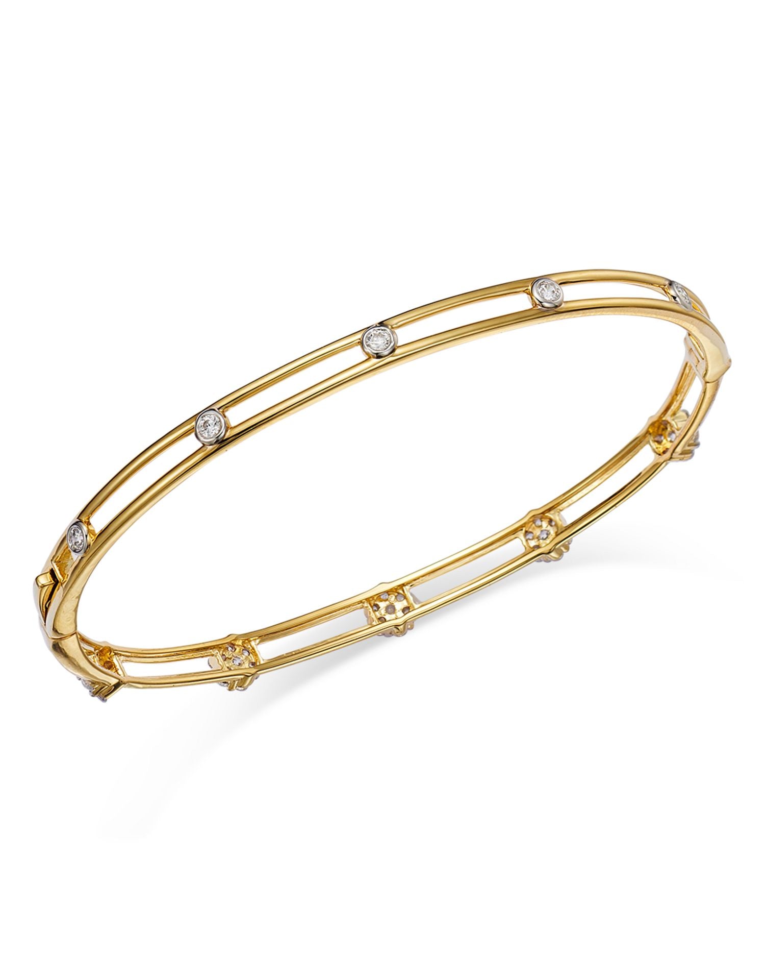 This Diamond Bezel Bangle Bracelet by Bloomingdale's Fine Collection is a luxurious and versatile piece, featuring sparkling diamond bezels on a sleek open bangle design. Perfect for layering or wearing alone for a refined look.