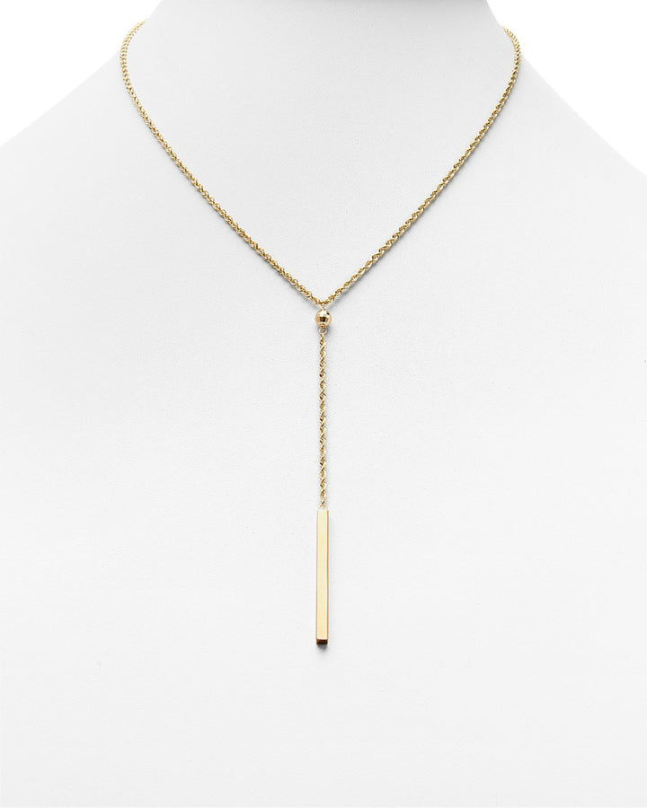 This 14K Yellow Gold Rope Chain Bar Drop Necklace by Bloomingdale's Fine Collection is a sleek and modern design. Its elongated drop adds an elegant touch, making it perfect for layering or wearing as a statement piece.