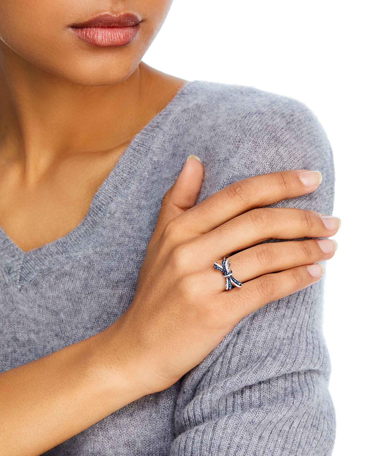 This Blue Sapphire & Diamond Bow Ring by Bloomingdale's Fine Collection is a charming and glamorous design. The elegant bow shape, accented with blue sapphires and diamonds, makes it a perfect statement piece or meaningful gift.