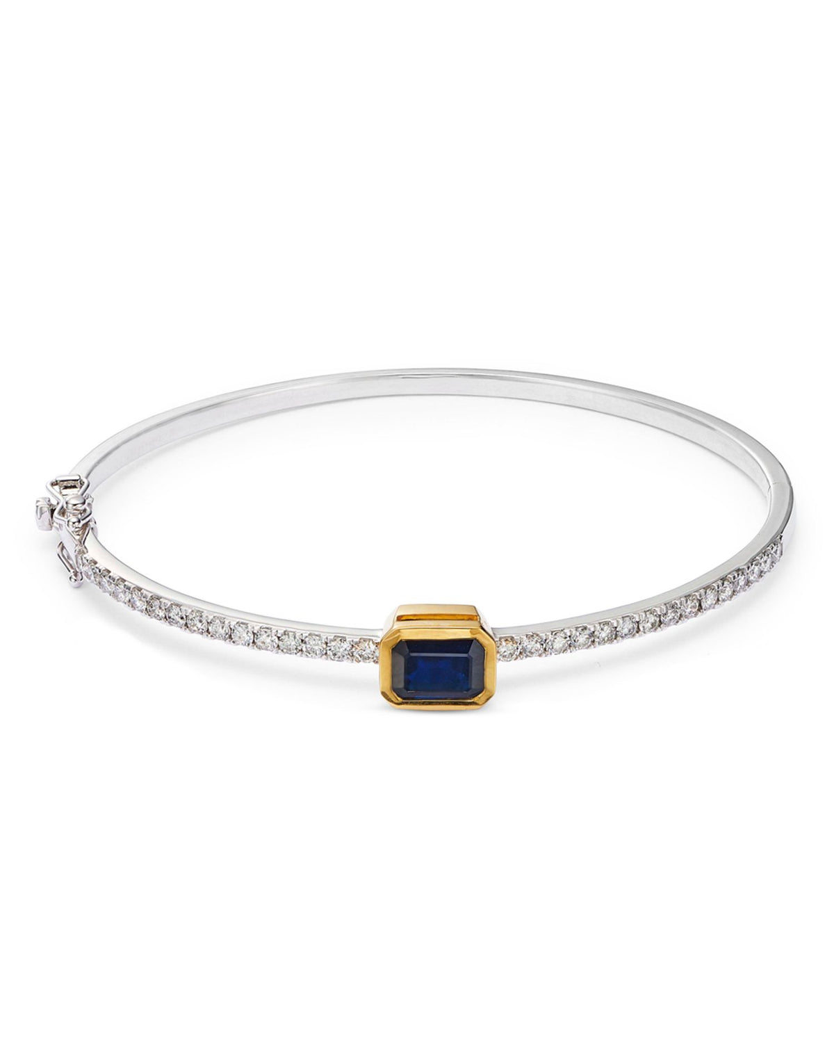This Gemstone & Diamond Station Bangle Bracelet by Bloomingdale's Fine Collection combines vibrant gemstones with the brilliance of diamonds in a sophisticated two-tone gold design. Available in blue sapphire, ruby, or emerald, it is a luxurious addition to any outfit.