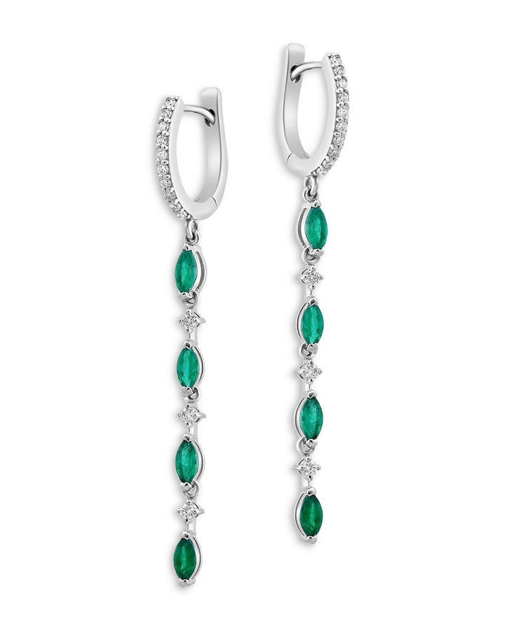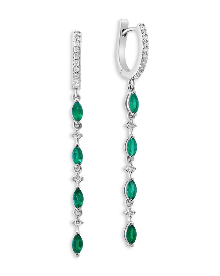 These Emerald & Diamond Dangle Hoop Drop Earrings by Bloomingdale's Fine Collection bring striking elegance with marquis-cut emeralds and diamond chains suspended from diamond-encrusted hoops. A luxurious statement piece, they exude sophistication.