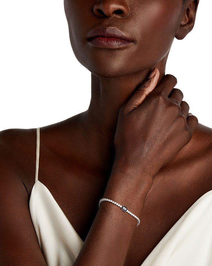 This Gemstone & Diamond Station Tennis Bracelet by Bloomingdale's Fine Collection offers a luxurious combination of colorful gemstones and brilliant diamonds in a classic tennis bracelet design. Available in ruby, sapphire, or emerald options, it’s perfect for any occasion.