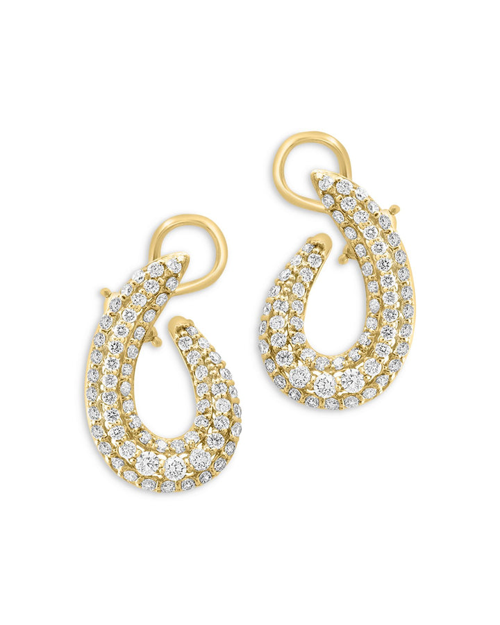 Crafted in 14K yellow gold with 2.50 carats total weight of diamonds (HI color, I1-I2 clarity). Earrings measure 0.97 inches in length and feature omega back closures. Made in the USA.
