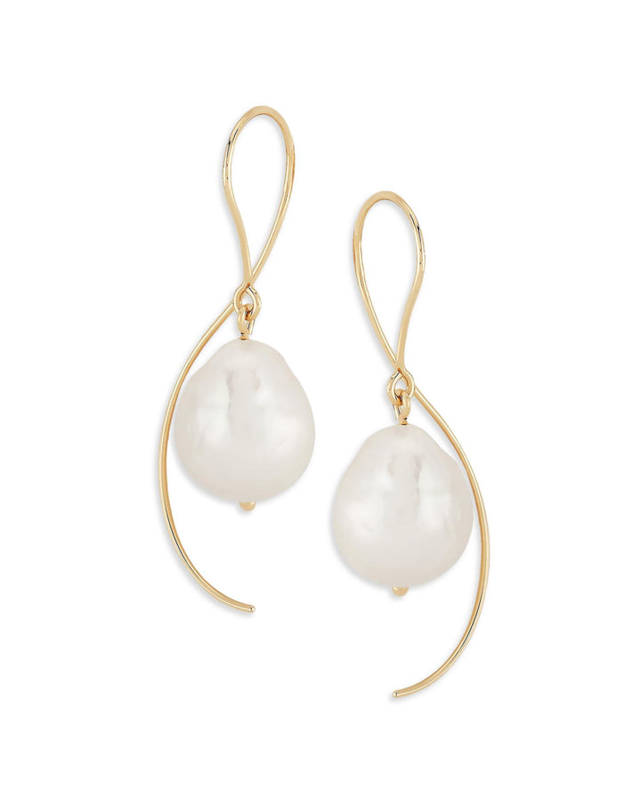 These 14K Yellow Gold Cultured Freshwater Baroque Pearl Drop Earrings by Bloomingdale's Fine Collection are glamorous and versatile. Featuring dangling Baroque pearls from a curved gold wire, they are perfect for any occasion.