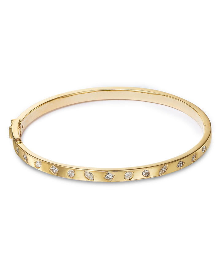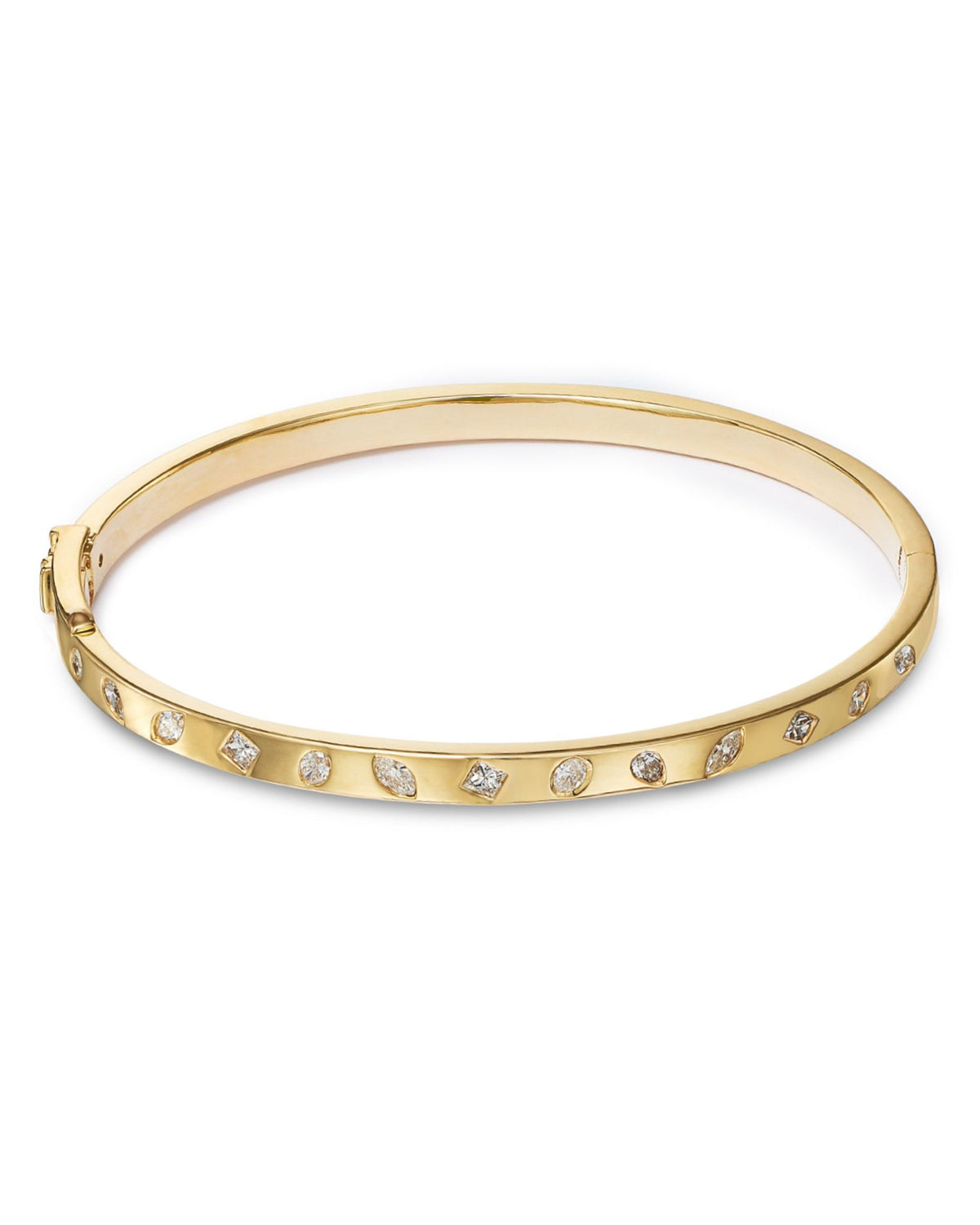 This Diamond Round and Full Cut Bangle Bracelet by Bloomingdale's Fine Collection exudes delicate elegance. Scattered round and full-cut diamonds adorn the slim gold bangle, making it a timeless and versatile addition to your jewelry collection.
