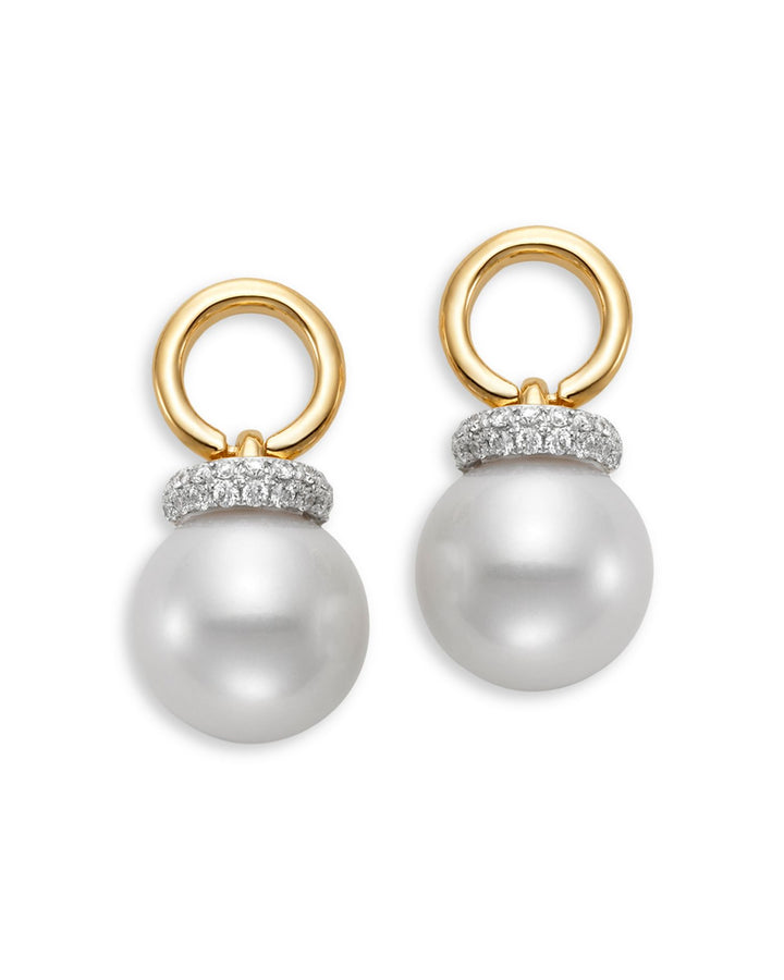 Handcrafted in 14K yellow gold. Accented with 9-9.5mm cultured freshwater pearls and 0.15 carat total weight of HI/I1 diamonds. Length: 0.75'. Secured with post back closures.
