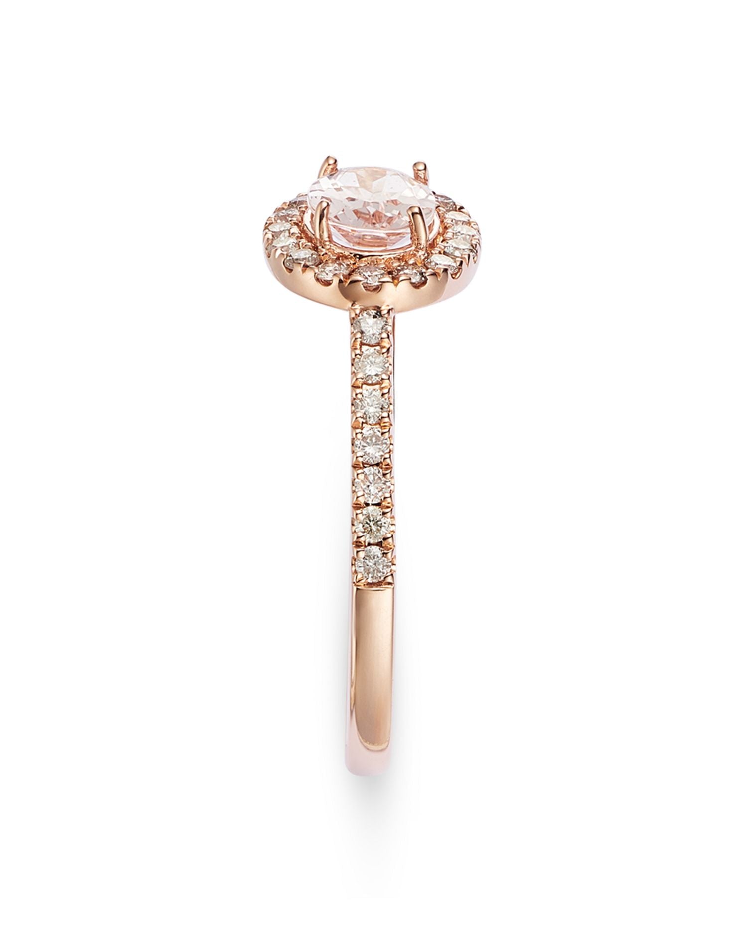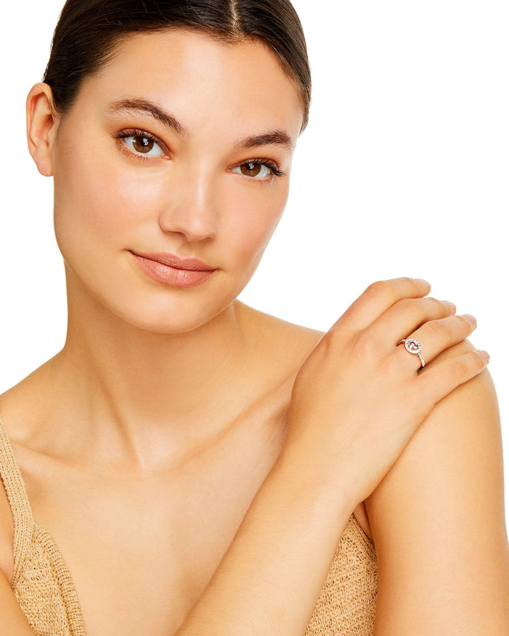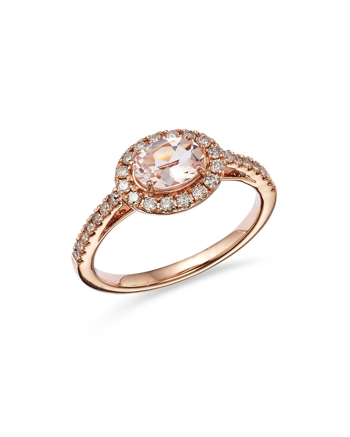 Morganite & Diamond Oval Halo Ring by Bloomingdale's Fine Collection exudes romantic sophistication. Featuring an oval-cut morganite center stone surrounded by sparkling diamonds on a rose gold band, this ring is a stunning choice for special occasions.