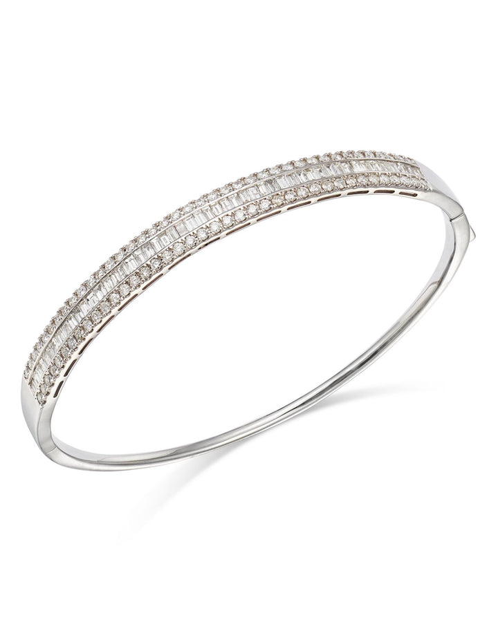 Diamond Baguette & Round Bangle Bracelet by Bloomingdale's Fine Collection is the epitome of arm candy elegance. Featuring a sophisticated blend of baguette and round-cut diamonds, this white gold bangle bracelet is a dazzling statement piece perfect for any occasion.