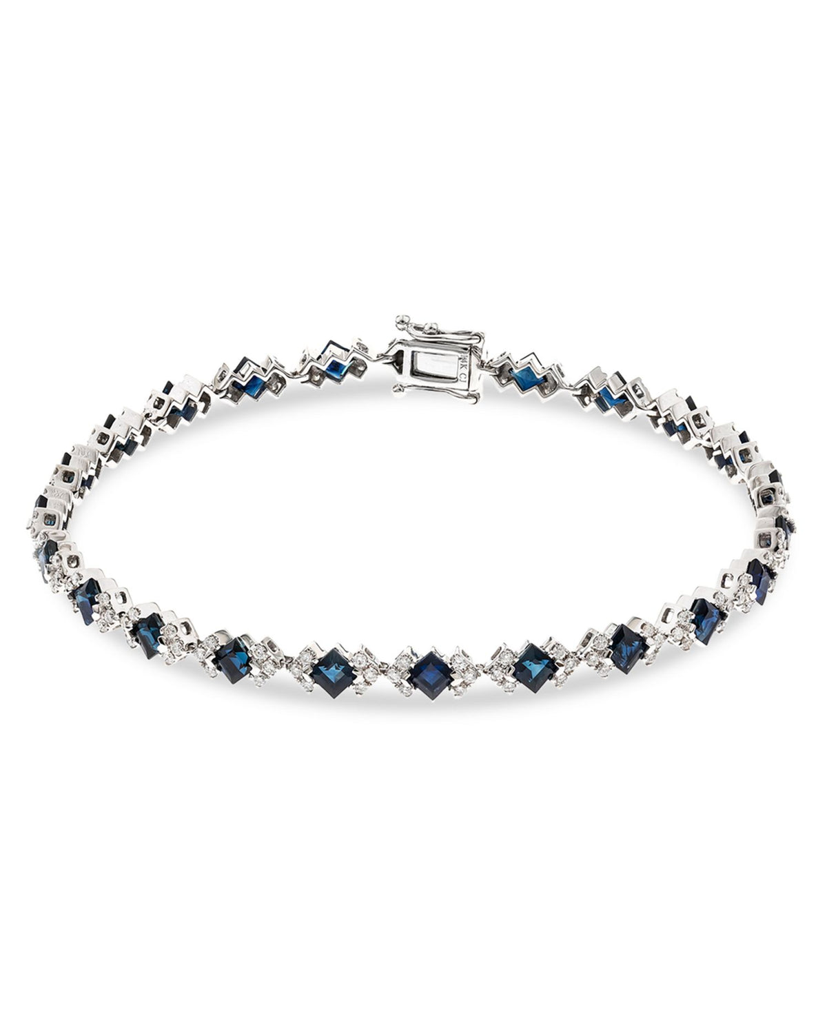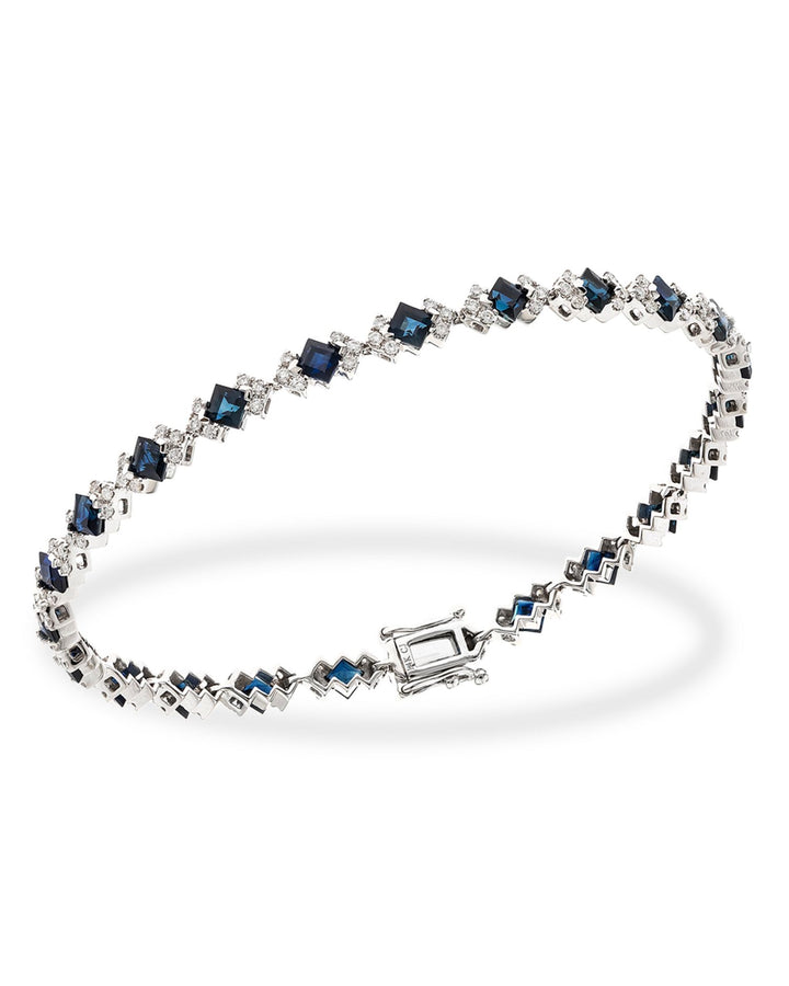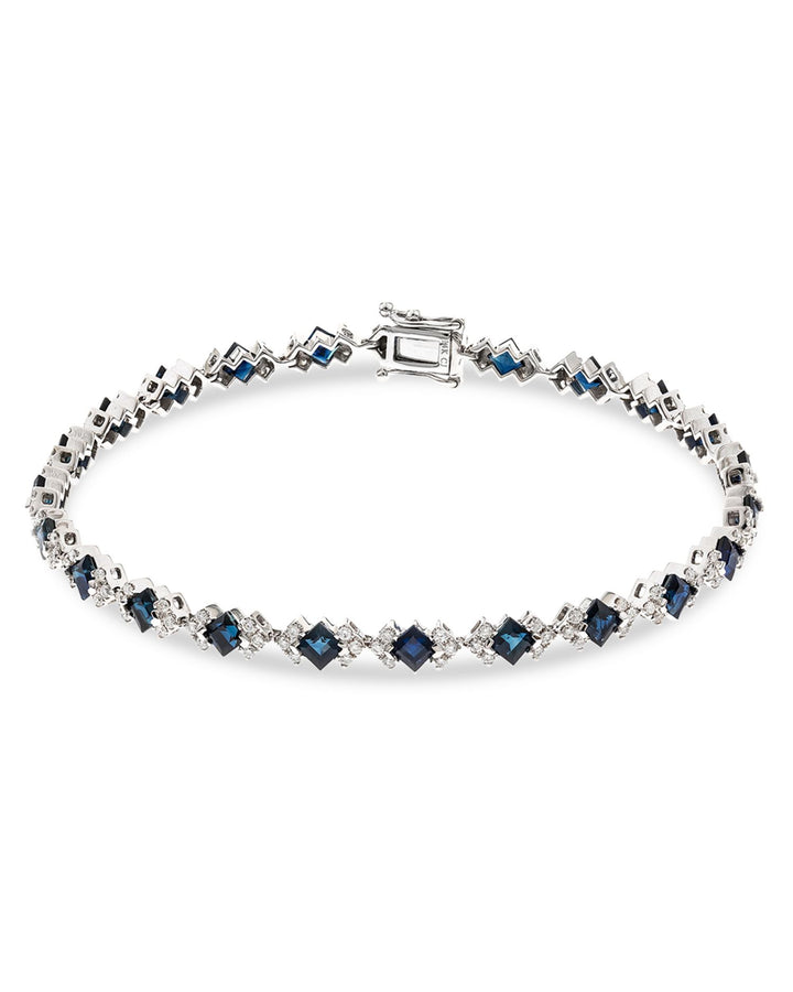 Handcrafted in 14K white gold, surface-coated with rhodium. Set with 3.85 carat total weight of blue sapphires and 1.05 carat total weight of GH/I1 diamonds. Length: 7.25'. Secured with a box lock clasp closure.