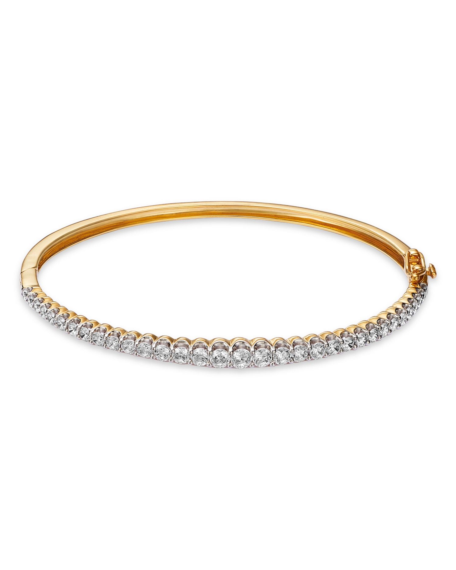 Diamond Graduated Bangle Bracelet by Bloomingdale's Fine Collection exudes glamour with its stunning design. Featuring graduated diamonds set in yellow gold, this bracelet is perfect for adding timeless elegance to your look.