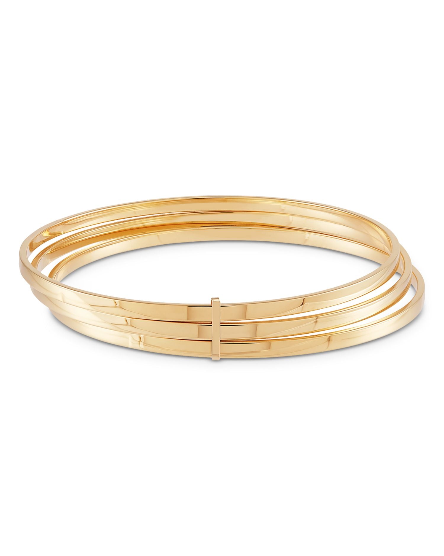 14K Yellow Gold Polished Trio Bar Slip Bangle Bracelet by Bloomingdale's Fine Collection is a sleek and modern accessory. Featuring three polished gold bangles joined by a minimalist bar ring, this Italian-made bracelet is perfect for adding understated elegance to your look.