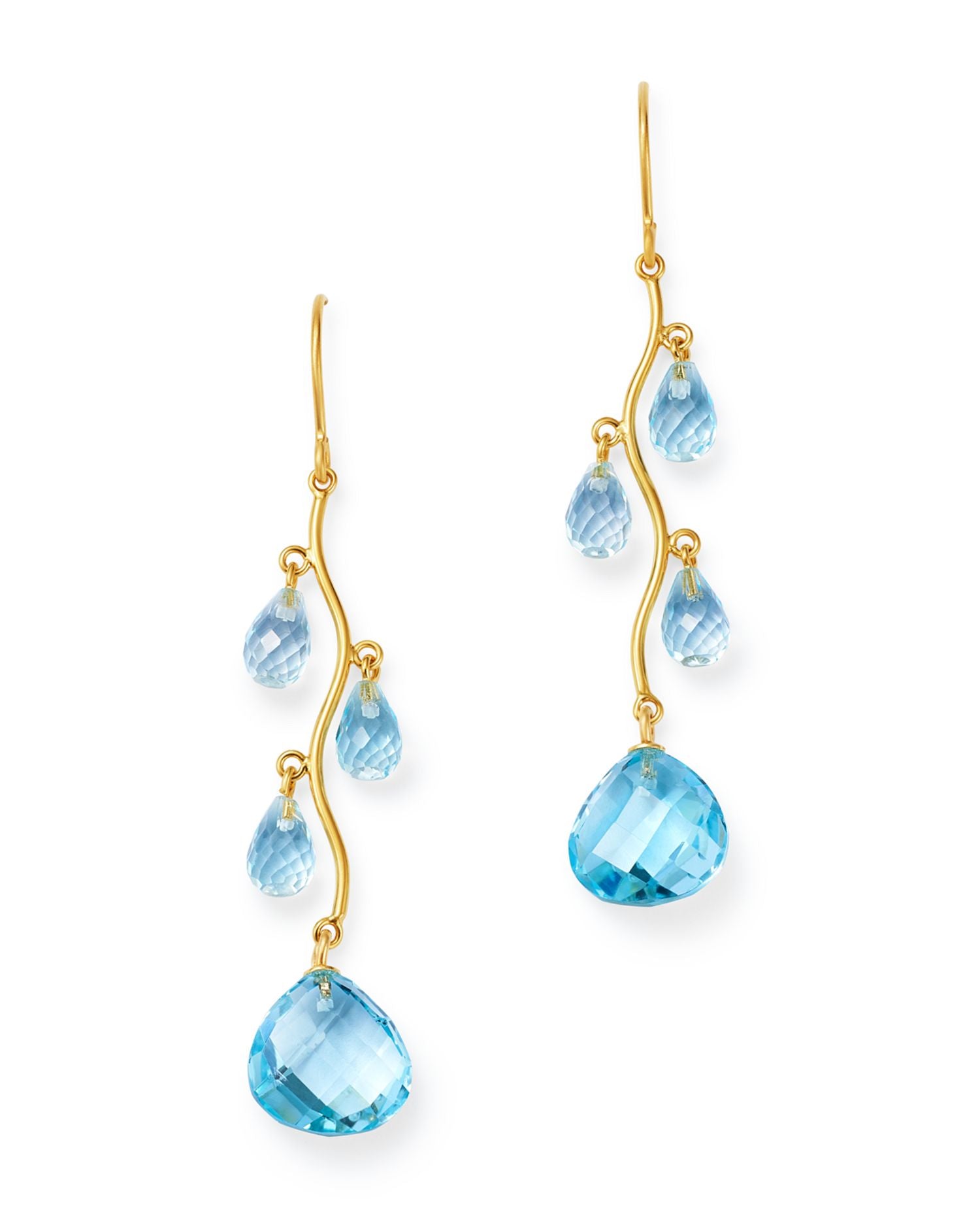 Handcrafted in 14K yellow gold. Set with blue topaz gemstones. Length: 2.12". Secured with French wire closures.