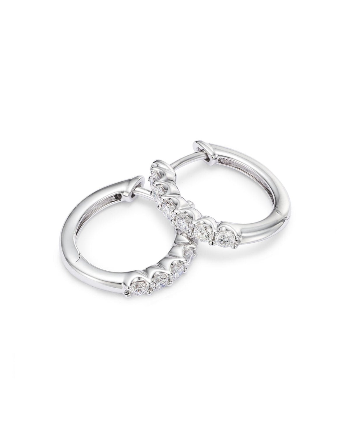 Handcrafted in 14K yellow or white gold. Set with 0.34 carat total weight of GH/I1-I2 diamonds. Diameter: 0.5'. Secured with hinge hoop closures. Items sold separately.