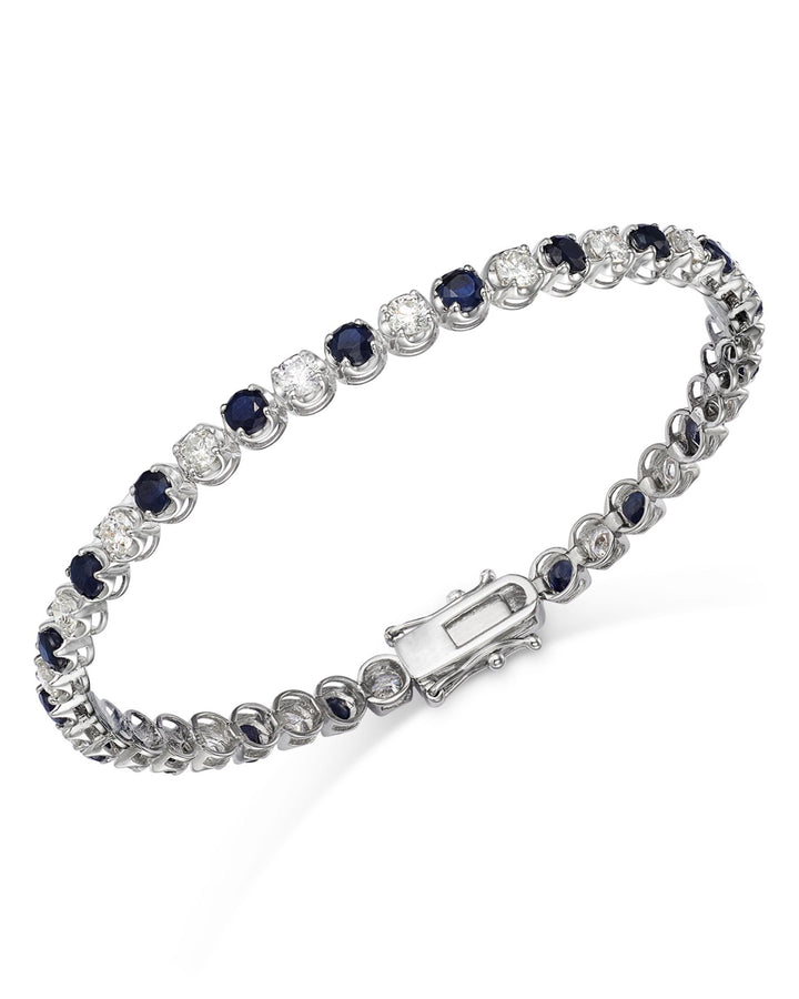 This Precious Gemstone & Diamond Tennis Bracelet by Bloomingdale's Fine Collection offers a striking blend of gemstones and diamonds. Available in blue sapphire, emerald, or ruby, the bracelet features diamonds that sparkle against the vibrant gemstones, creating a luxurious, eye-catching look. This bracelet is perfect for adding a pop of color and elegance to any outfit.