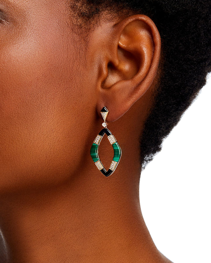 These Malachite, Onyx & Diamond Drop Earrings by Bloomingdale's Fine Collection are a stunning celebration of contrast and color. Featuring vibrant malachite, sleek onyx, and sparkling diamonds, these earrings are the perfect blend of sophistication and modern flair.