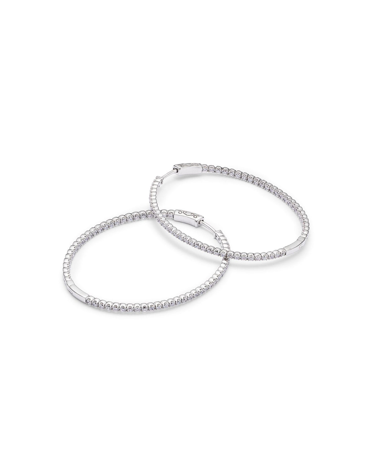 Handcrafted in 14K white gold with 2.0 ct. t.w. diamonds (color/clarity: HI/I1I2). Earrings measure 1.84' in diameter and are secured with hinge hoop closures. White gold is surface-coated with rhodium for enhanced shine, which may require replating over time.
