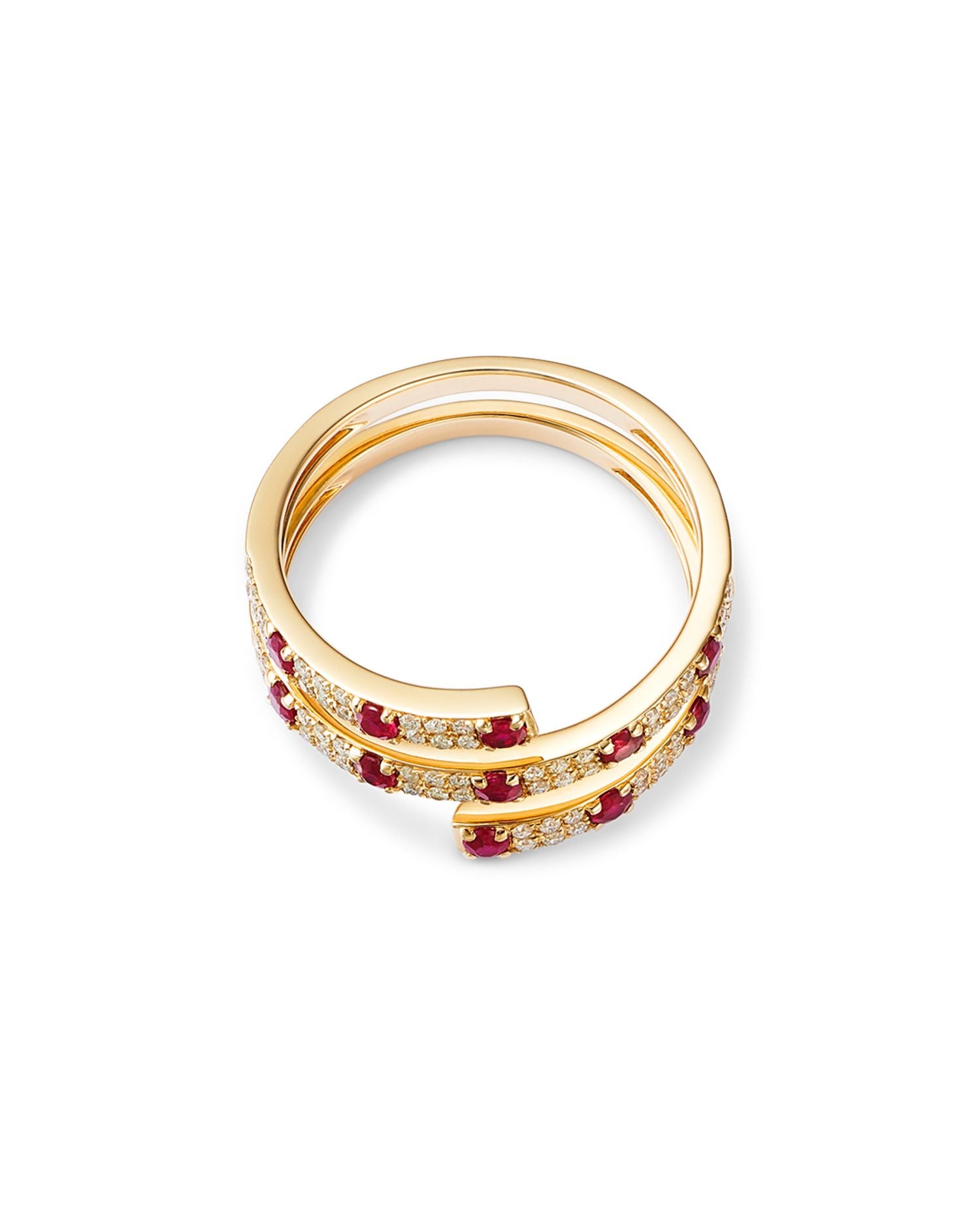 This 14K Yellow Gold Ruby & Diamond Twist Ring by Bloomingdale's Fine Collection is a breathtaking piece. Its twist design is accented by vibrant rubies and rows of sparkling diamonds, creating a bold and sophisticated statement.
